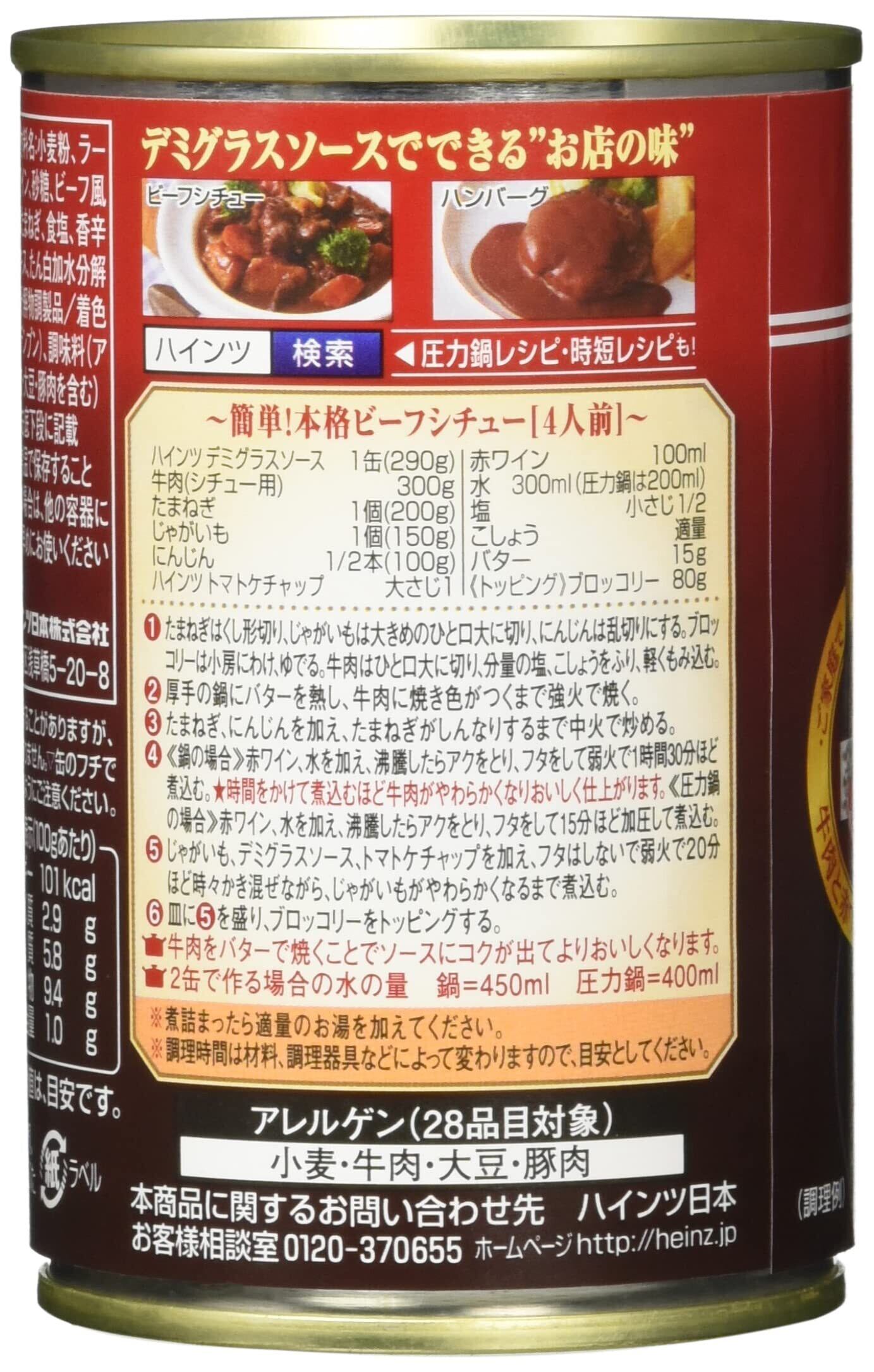 小麦粉、ラード、トマトペースト、牛肉、赤ワイン、砂糖、ビーフ風味エキス、ビーフエキス、乾燥たまねぎ、食塩、香辛料、たまねぎエキス、ポークエキス、たん白加水分解物、酵母エキス、たん白加水物調製品(たん白加水分解物、砂糖、食塩、その他)/カラメル色素、増粘剤(加工デンプン)、調味料(アミノ酸等)、(一部に小麦・牛肉・大豆・豚肉を含む)