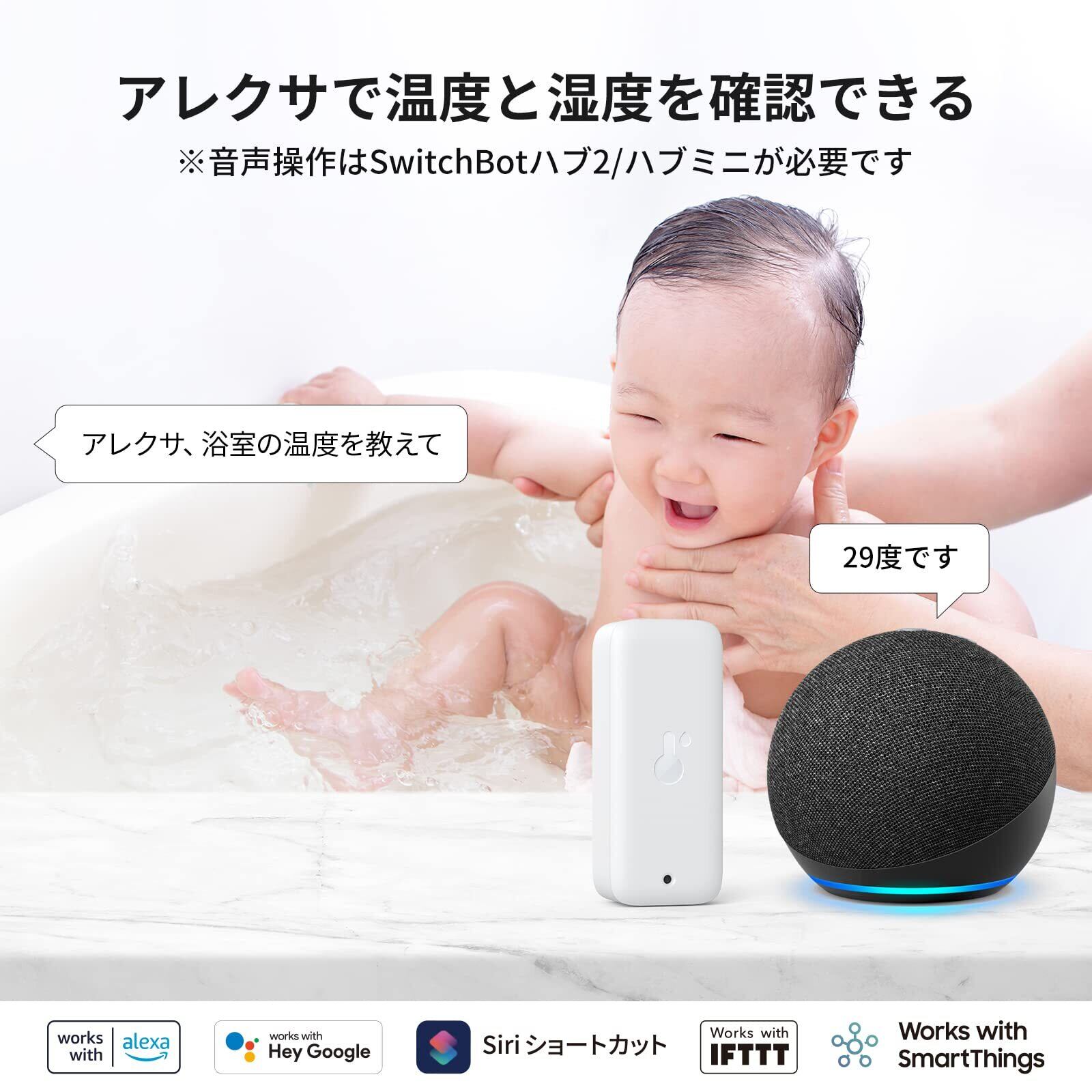 【アレクサでお部屋の温湿度を把握】アレクサに聞くだけで、現在の気温と湿度をすばやく確認できます。Alexa以外に、GoogleアシスタントやSiri ショートカットも対応しています。音声操作はSwitchBotハブシリーズが必要です。