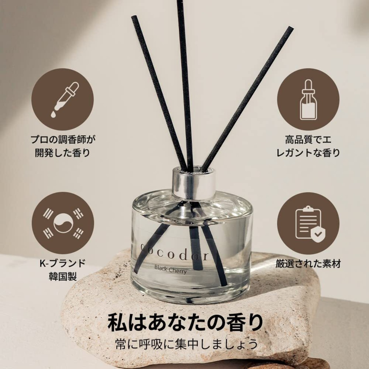 【リードディフューザーセット】高品質アロマオイル200mlに、透明なCocod'orシグネチャーガラスボトルとブラックファイバースティック5本を添えた芳香剤。香りで満たしつつ、洗練されたインテリアとしても美しく映えます。