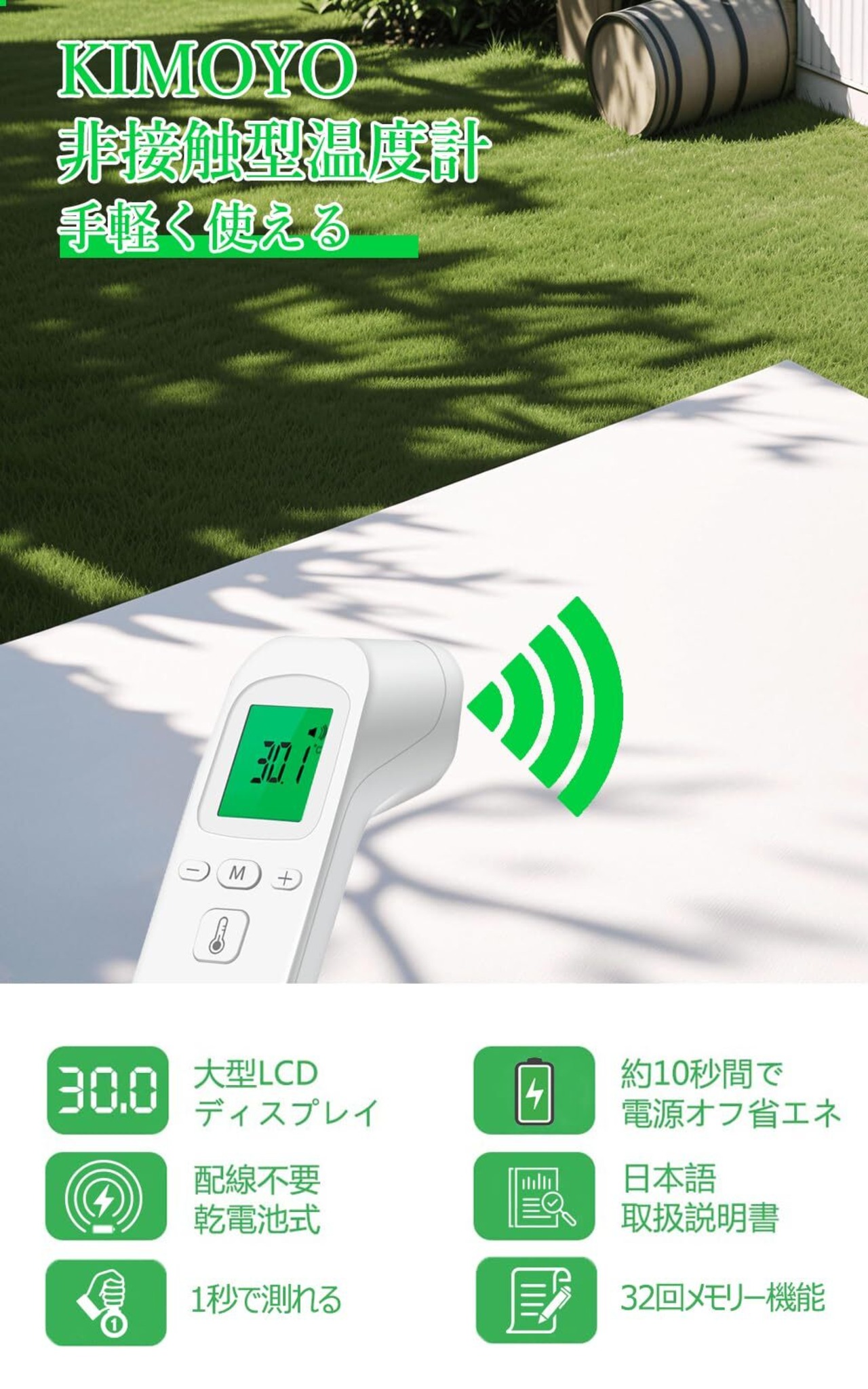 KIMOYO 非接触式電子温度計 赤外線:1秒測定 32回記録 非接触温度 屋外 KC011
