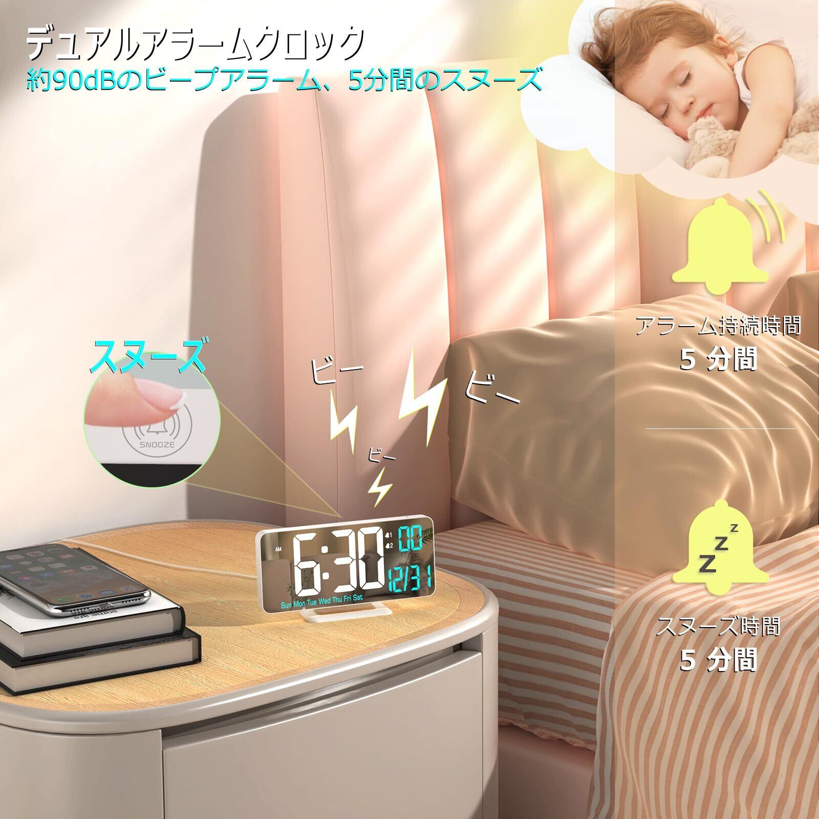 [6.7インチ ホワイト目覚まし時計] このスタイリッシュなLED置き時計は、ミラー時計スタイルの6.7インチディスプレイ、デュアルアラーム、12/24時間形式、日付、曜日、秒、温度(℉/℃)、自動/ 手動調光機能があり、白とスカイブルーの数字が付いた寝室用の美しいデジタルカレンダーとかわいい目覚まし時計でもあります。 さらに、明るく大きな白とスカイブルーの数字が、卓上時計をクールで読みやすくします。