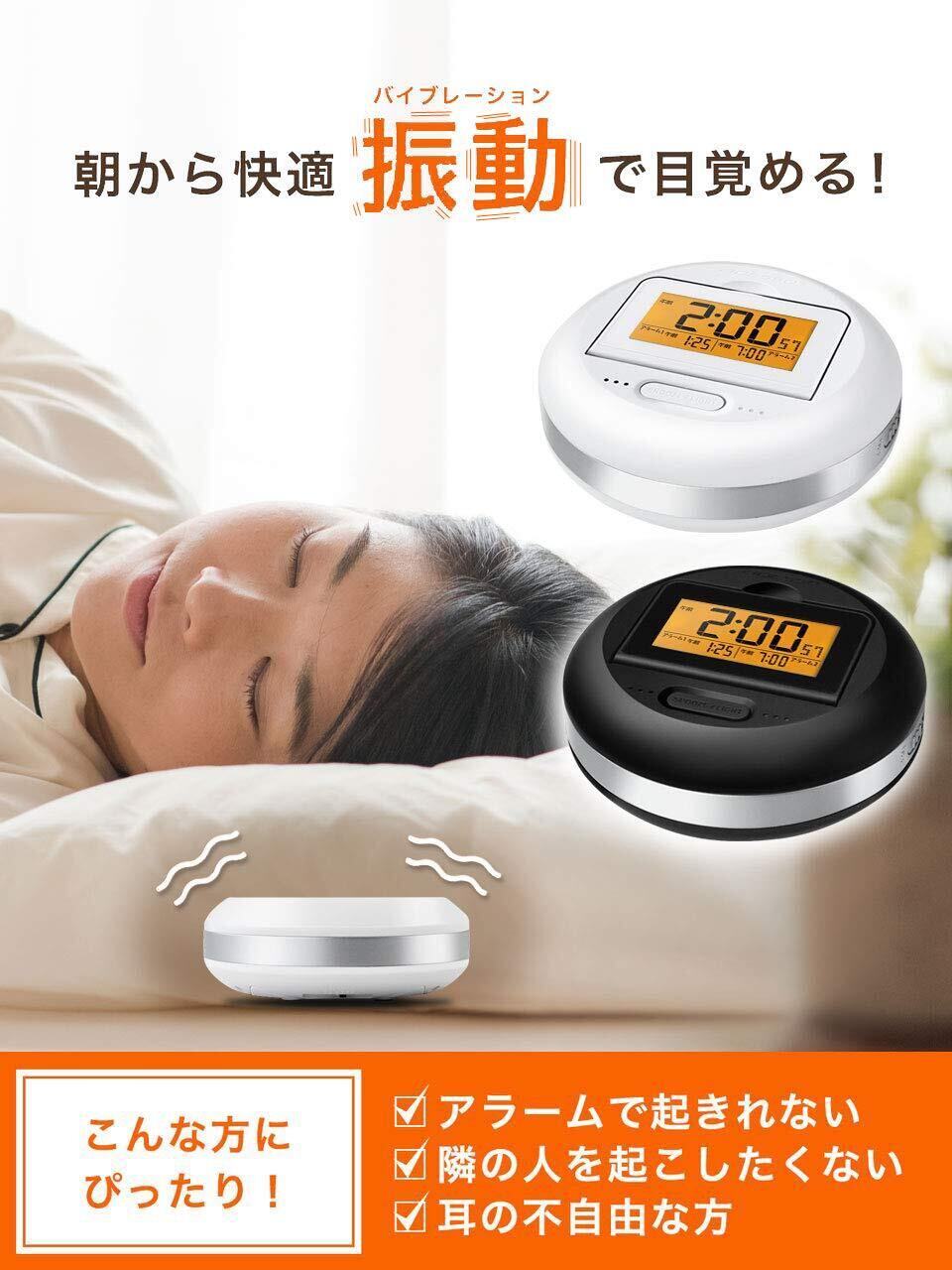 【こんな方におすすめ】アラーム音だけでは起きれない、同室にいる家族や隣の人を起こしたくない、耳の不自由な方に最適な時計です。アラームは3つのモード(音、振動、音+振動)で切り替えができ、自分の使用目的に合わせて使うことが可能です。本体サイズが小さいので、出張先や旅行などへ持って行って使うのも便利です。