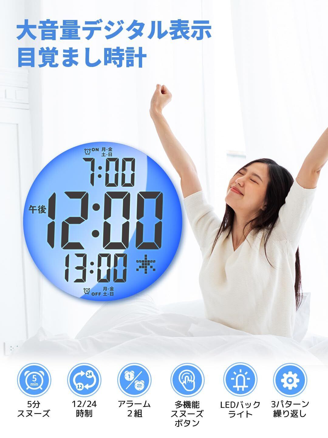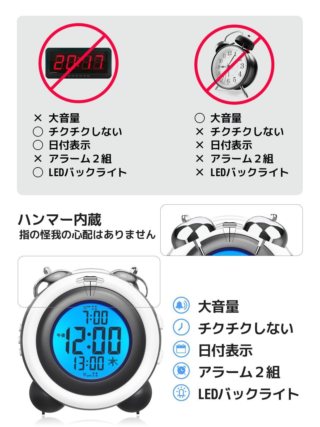 目覚まし時計 大音量 デジタル ベル ダブルアラーム スヌーズ 機能 LED バックライト アラーム 2つ LCD デジタル ディスプレー 電池式 卓上 置き時計 多機能スヌーズボタン/デュアルアラーム/チクチクしない/乾電池使用 日本語表示【意匠登録済み】