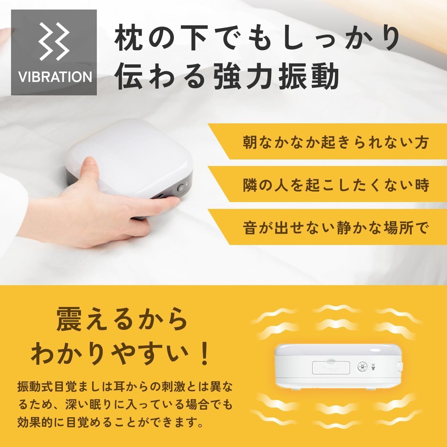 【光だけじゃない!振動モード・大音量アラーム搭載】光だけでなく強力な振動モード・アラーム音を搭載しています(ON、OFF切替可能)。枕の下に入れておくと、起床時間に大きなバイブレーションで起こします。起きるのが苦手な方も振動なら刺激が強いので目覚めやすい!振動のみのモードなら隣の人を起こさずに自分だけを起こす使い方もできます。【6種類の選べるアラーム】タイマー、ベル、ハト、小鳥のさえずり、波の音、メロディーの6種類のアラームを自由に選べます。5段階音量調整可能で、最大93dBの大音量。光だけで起きるのが不安な方は光と音を併用することができます。