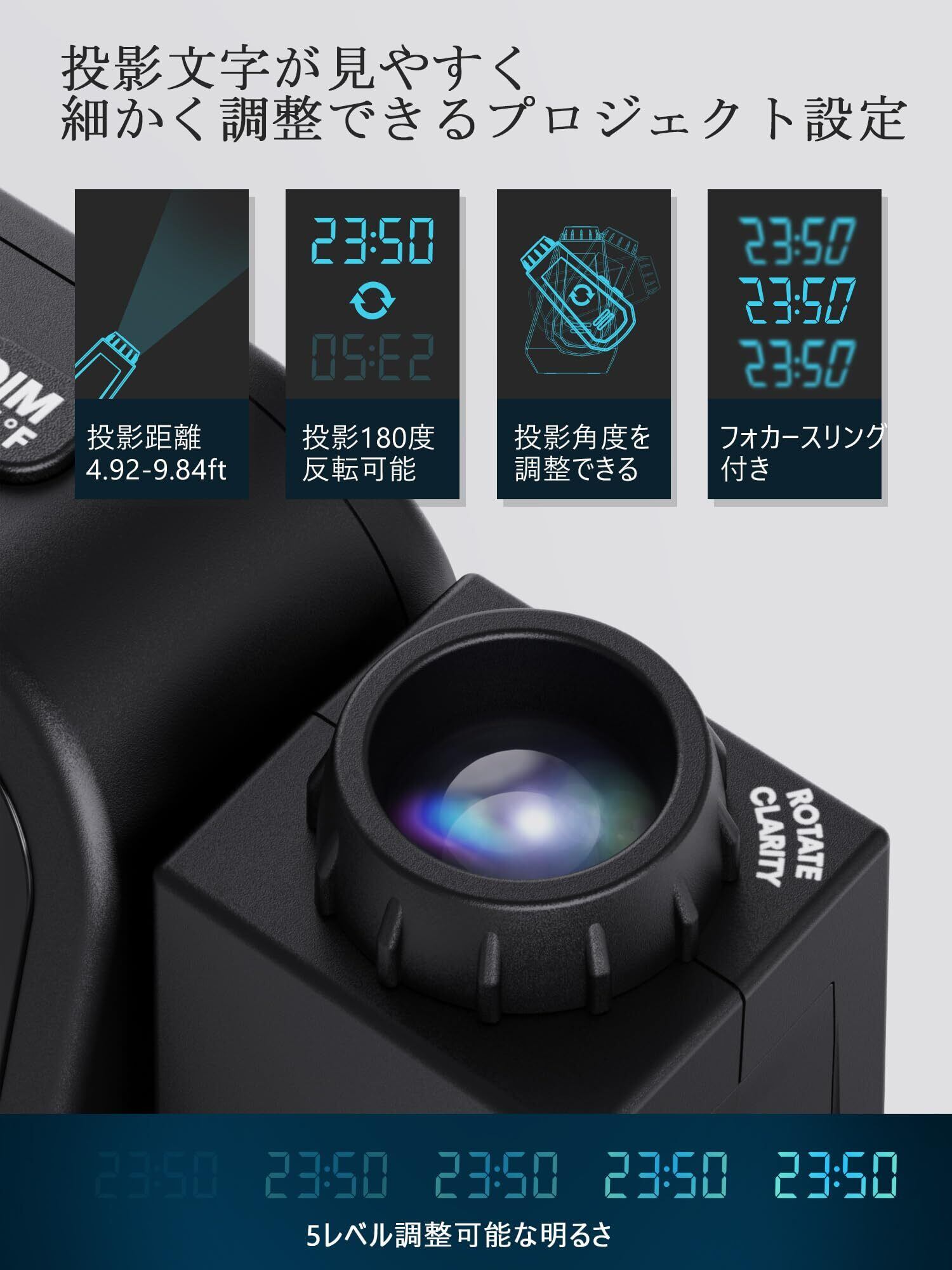 【180度回転可能なプロジェクタークロック】このプロジェクタークロックは、フォーカスコントロールリング付きの180度回転可能な時計であり、リバースボタンにより、どんな場面でも時間と角度の調整が可能です。超クリアな時刻を壁や天井に投影します。目が覚めたとき、最初に目に入るのは時間です。