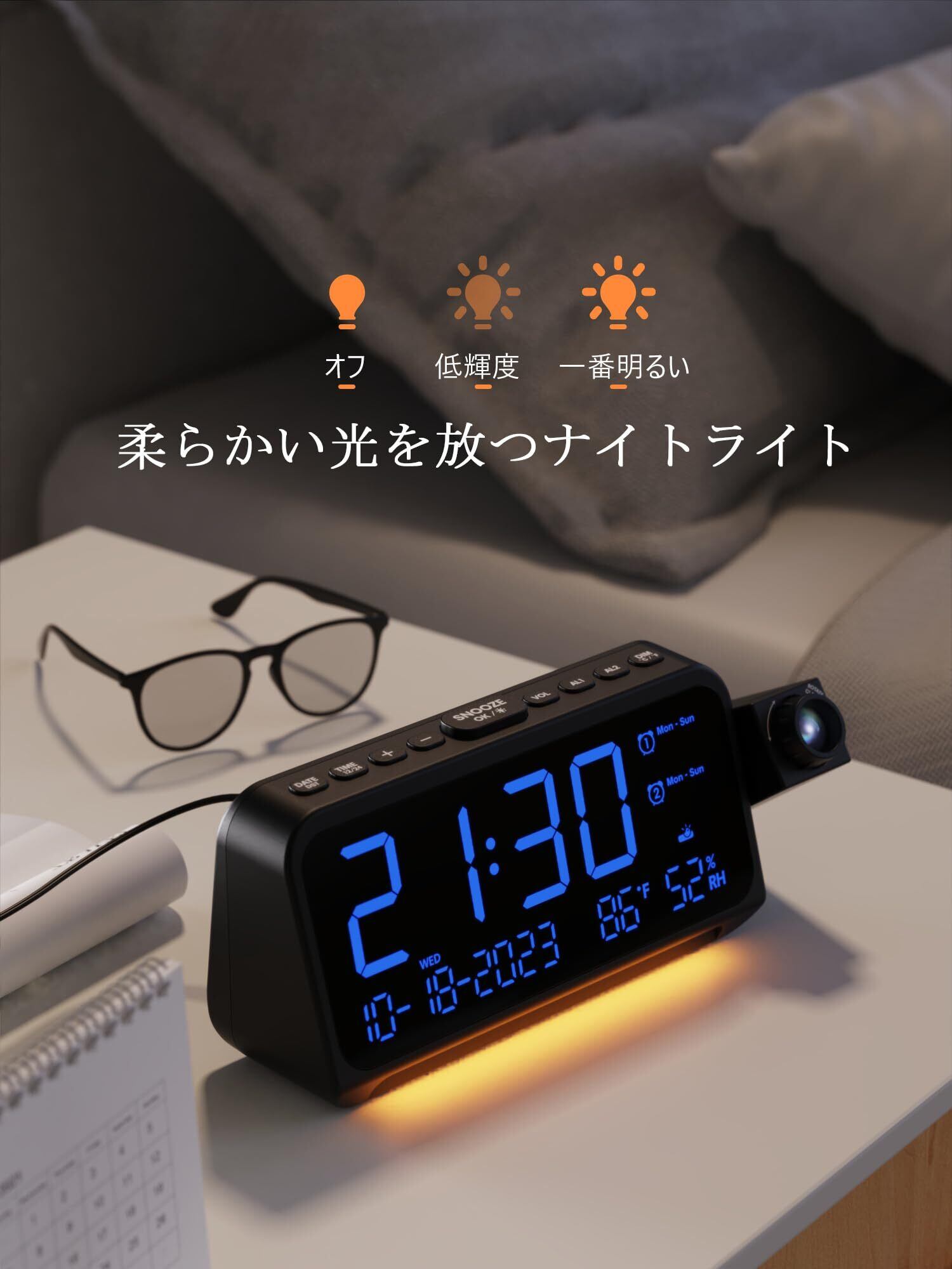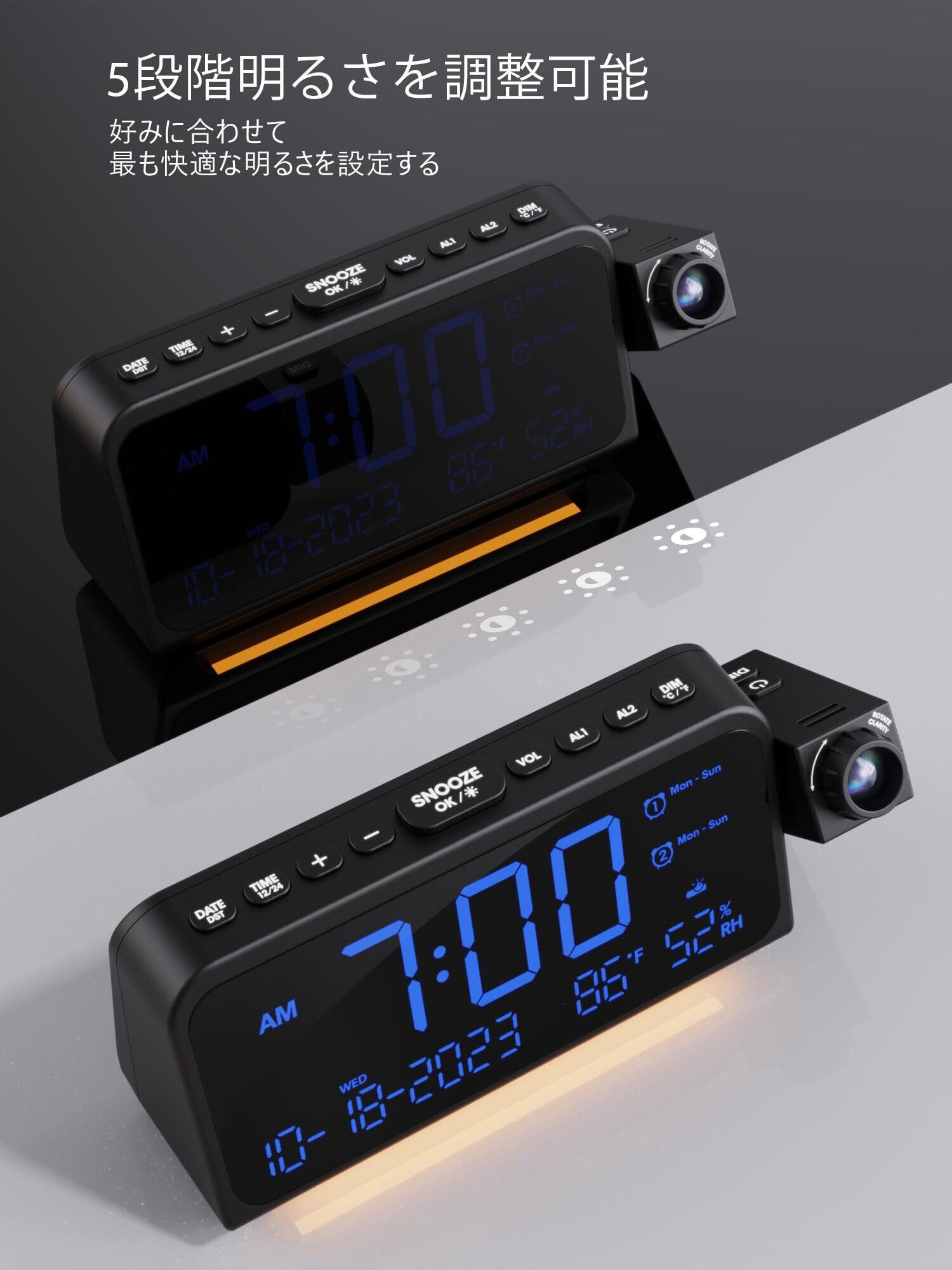 デジタル時計 壁投影 天井へ投影置き時計 プロジェクションクロック 350°投影角度対応&180°反転可能 温度・湿度・カレンダー表示 5段階明るさ調節&大音量で7段階ボリューム調整可能 デュアルアラーム 12/24時間切り替え スマホ充電可 寝室/リビング おしゃれな置き時計 ACアダプターで利用するタイプ