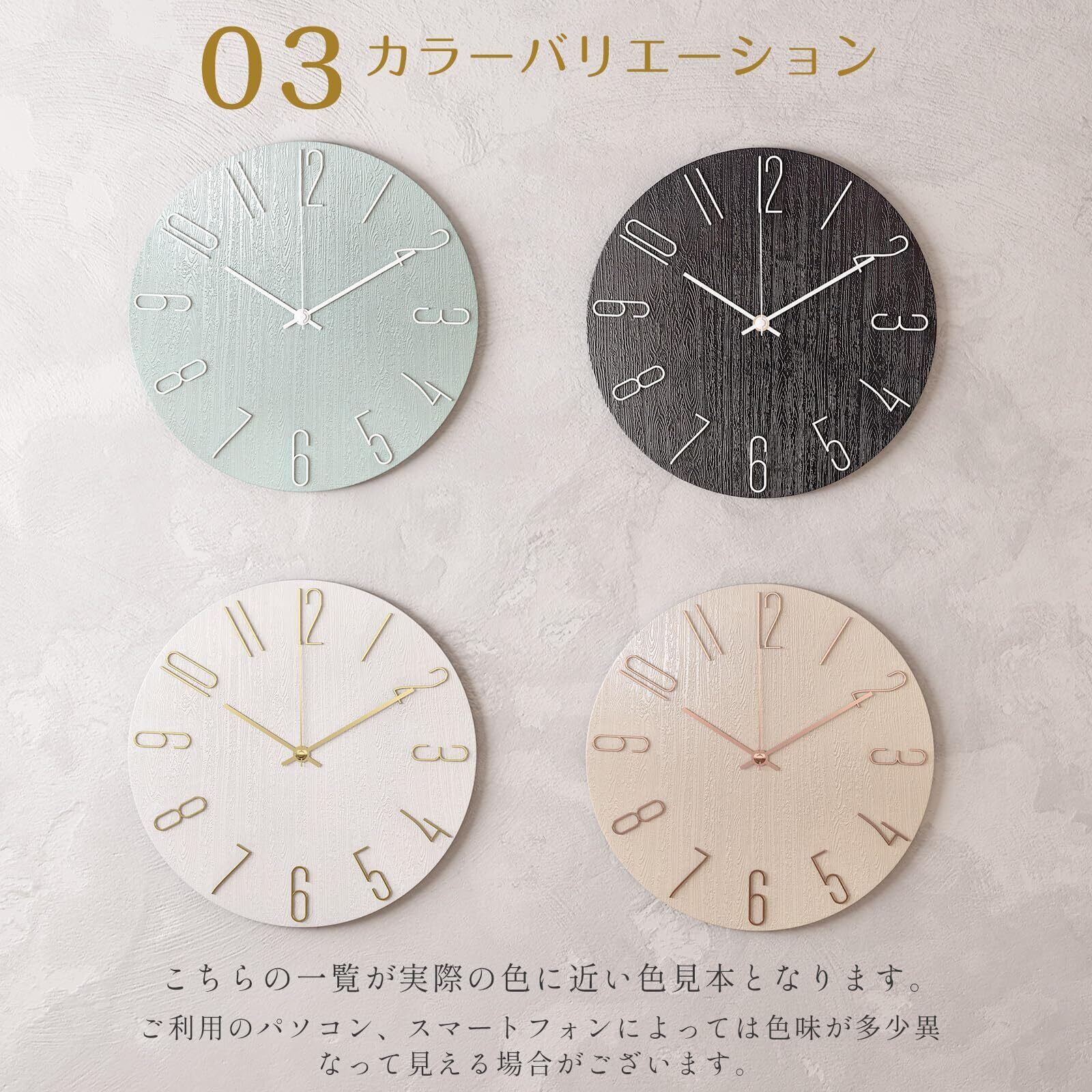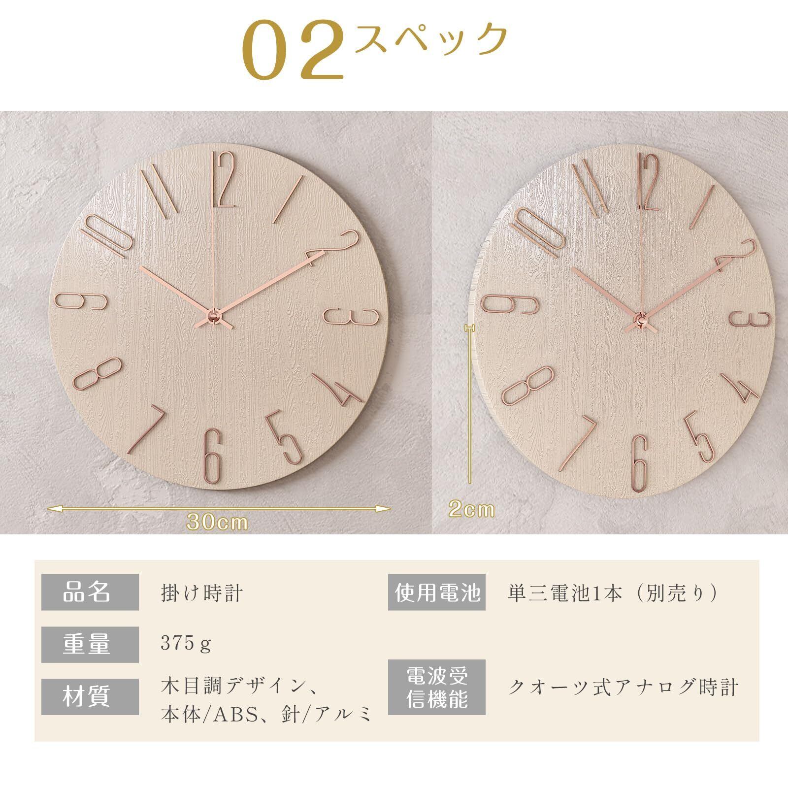 【商品仕様】サイズ:直径約30cm 厚さ:約2cm 重量:約375g 電源:単三電池x1(別売) 素材:美しい木目調(プラスチック製)、大文字の数字を採用して、年配の方やお子様でもはっきりと時間を確認できます。カチカチ音がしない静音仕様。勉強や就寝時、時間を忘れてリラックスしたい時にピッタリです。