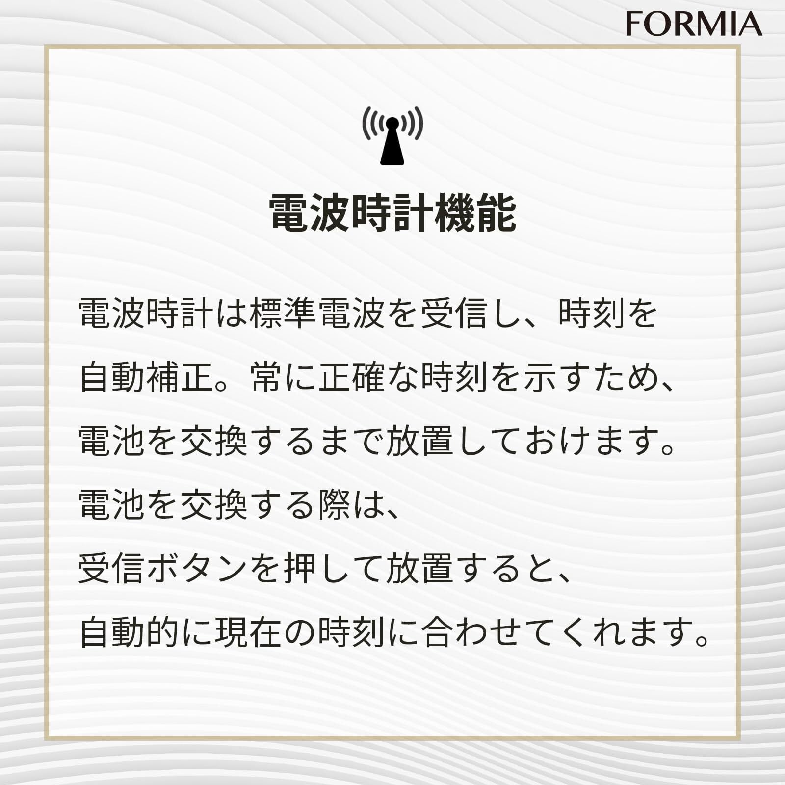 機能:電波受信機能(自動受信、手動受信)、夜間秒針停止機能(午後10:01~午前6:00)、ステップ秒針、置き掛け兼用