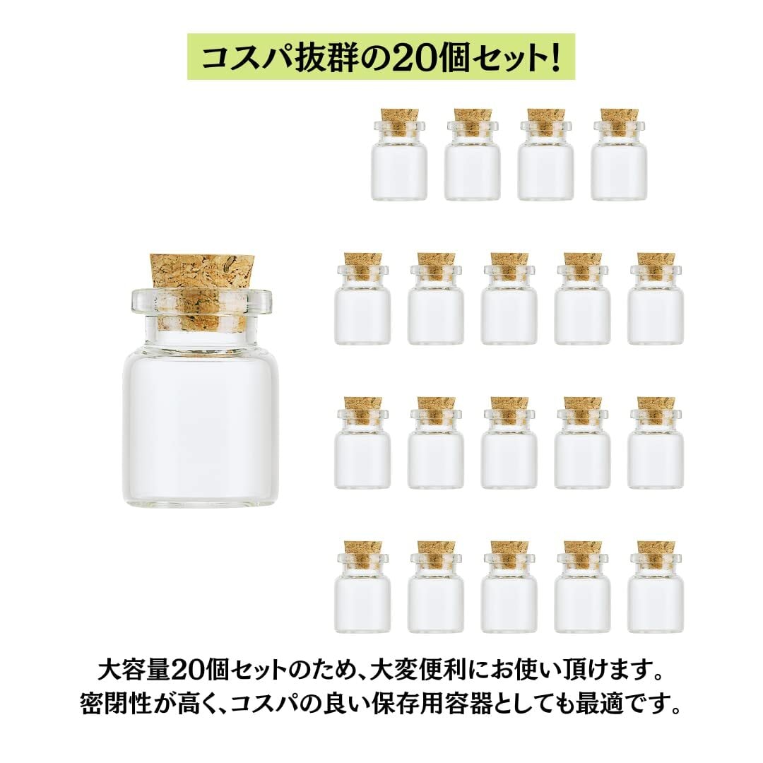 【コスパ抜群!20個セット】お得な大容量20個セットとなっておりますので、様々な用途で大変便利にお使い頂けます。全てのガラス瓶に密閉性の高いコルク製キャップが付属しておりますので、コスパの良い保存用容器としてもご利用頂けます。