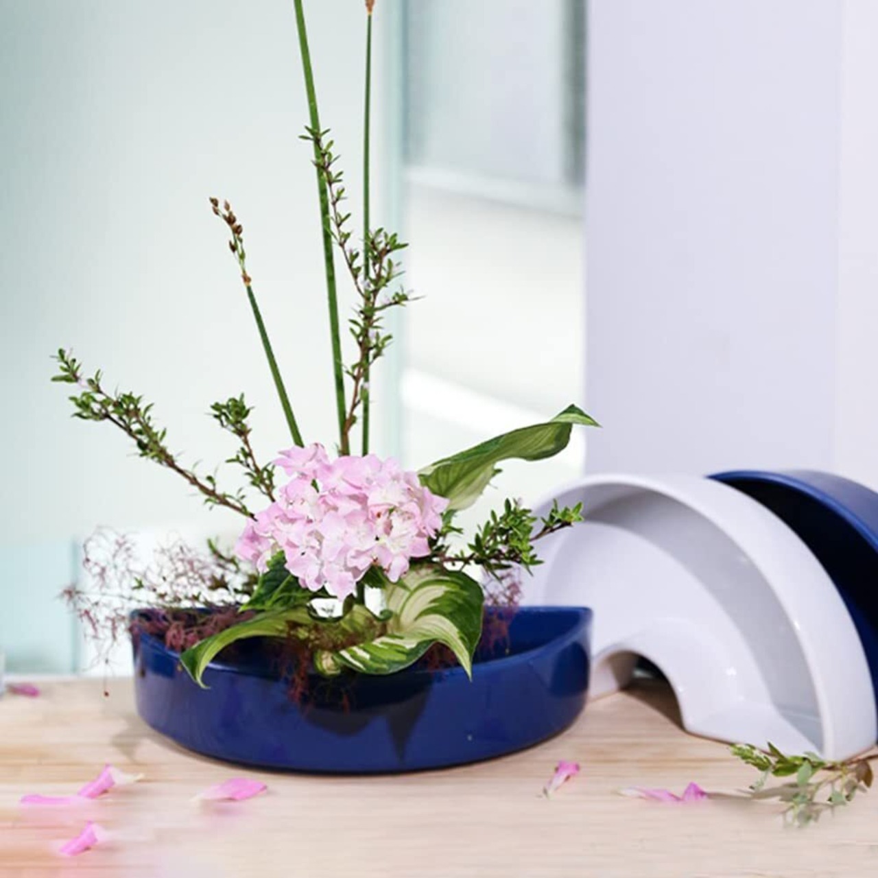 ✿様式:生け花用半円形水盤、ユニークな形、シンプルでエレガントなデザイン。2個半円水盤の組み合わせは形を配置できます。日本式にも、西洋式のフラワーアレンジメントにも適しています。図のように、花と草、枝の組み合わせは適します。
