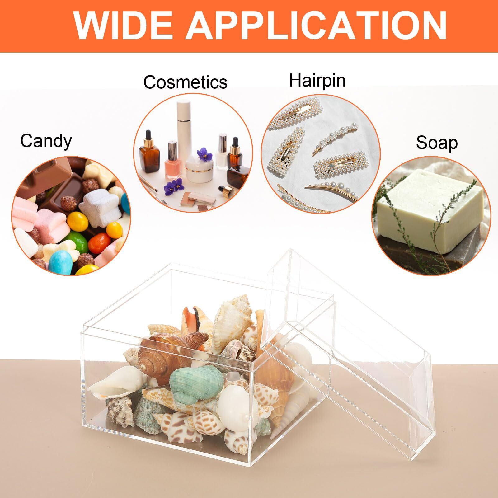 信頼性のあるアクリル製ボックス(蓋付き) - 透明なプラスチックボックスはアクリル製で、滑らかで軽量、頑丈で丈夫、破損しにくく、コンパクトで場所を取らず、持ち運びが簡単で長く使用できます。蓋のデザインにより、ほこりを防ぎ、内部のアイテムを清潔に保ちます。