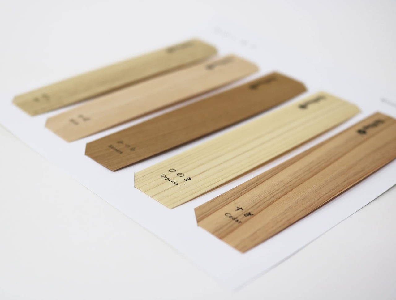 日本の無垢の木から作ったしおり。薄くスライスした木と木の間に和紙を挟んでおり、割れにくい作りになっています。樹種毎に異なる色合いや一枚ごと異なる木目をお楽しみ頂けます。