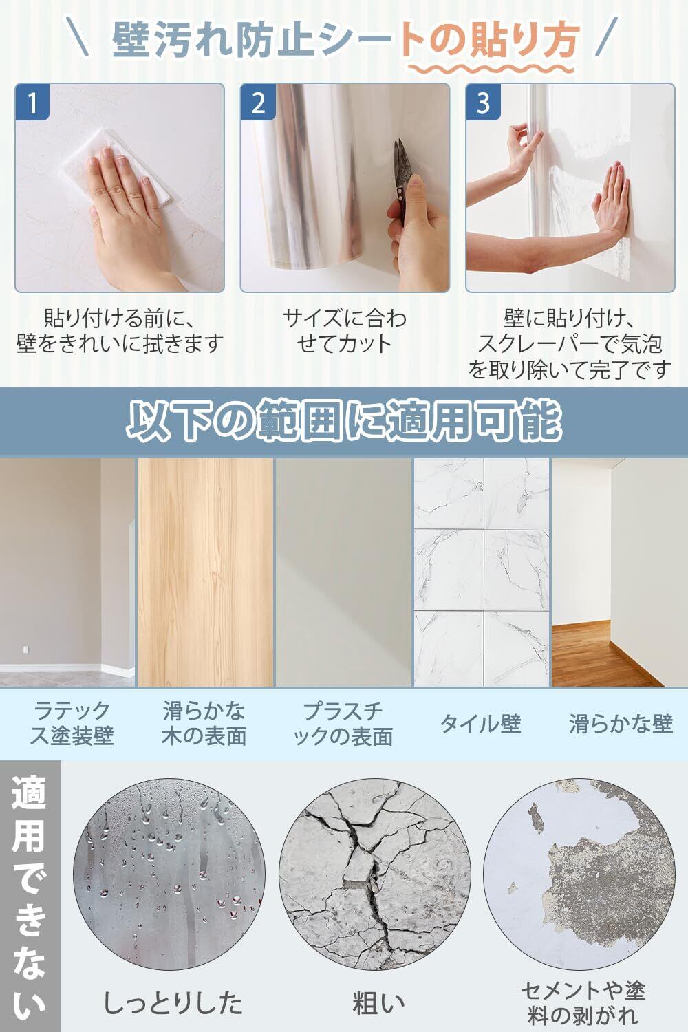 【透明で目立ちにくい、複数の場所に適用】透明保護シートは書斎、浴室、キッチン、リピング、トイレなど様々な場所でご使用いただけます。接着剤を使用しない、最新の静電吸着力、強吸着なのに繰り返しと貼ってはがせる特徴を持ちます。糊残り無し、壁紙保護シートを綺麗に剥がせます。