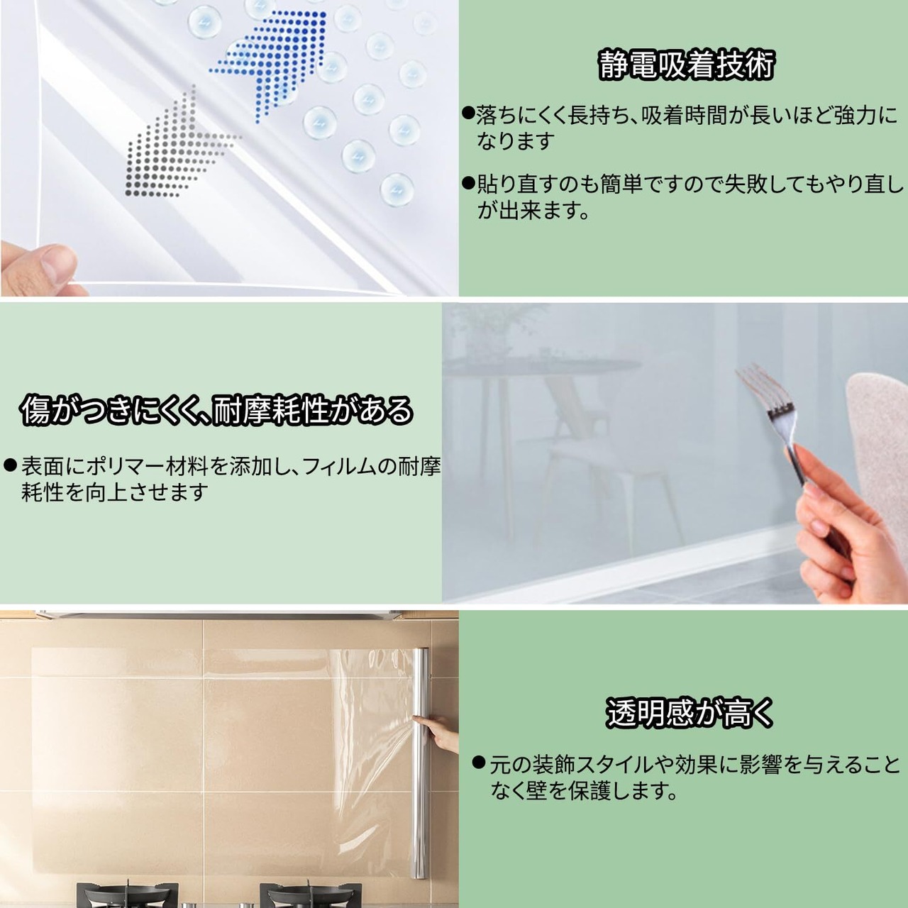 【初心者でも貼れる】:静電気吸着キッチン透明保護シートは、接着剤を使用せずに壁やタイルに自動的に吸着できます。貼り直すのも簡単ですので失敗してもやり直しが出来ます。汚れた時もサッと拭くだけで綺麗になります。