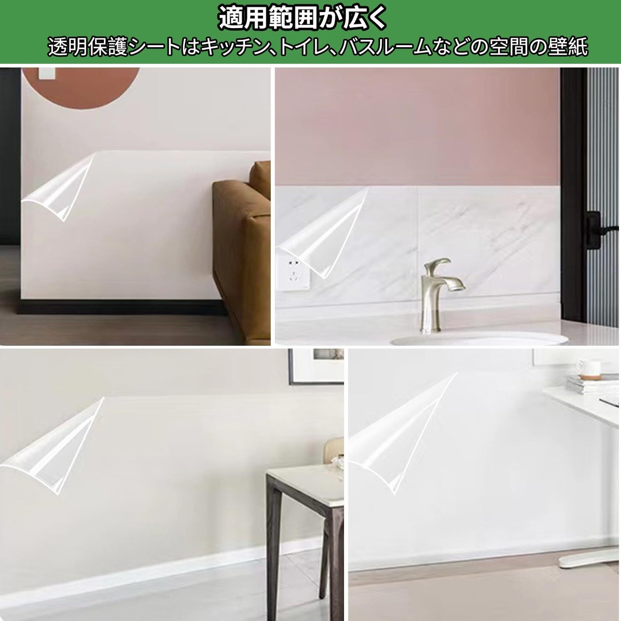 【適用範囲が広く】: 透明材料は任意の滑らかな表面に適用できる、壁効果や原型には影響しません。台所やレンジまわり、洗面台、トイレまわり、ガス台周りのパネル、浴室などでも、安心してご使用頂けます。