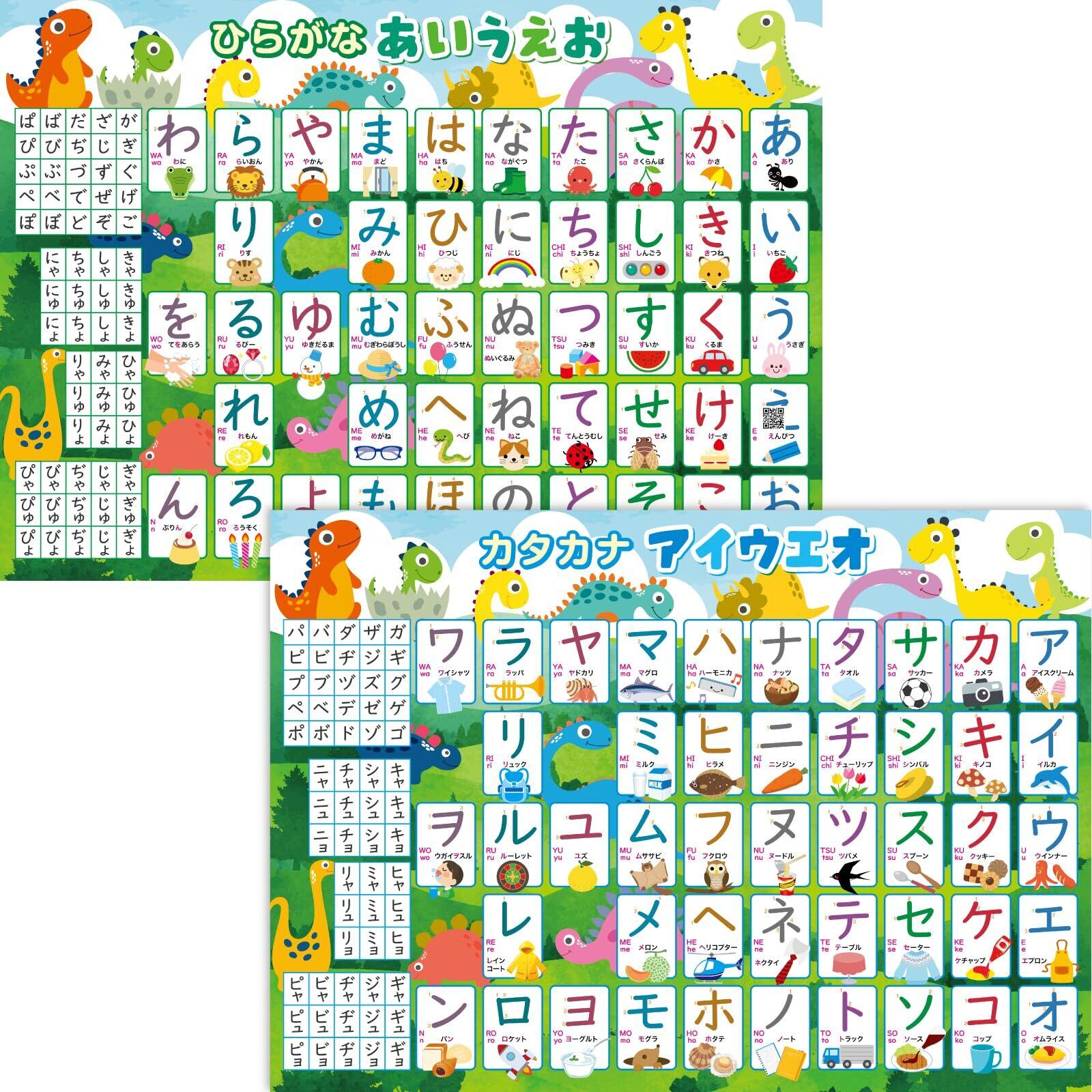 【視覚的に魅力的なデザイン】 ひらがな表とカタカナ表のポスターは、恐竜を背景にしたカラフルで子供たちの興味を引くデザインになっています。各文字には関連するイラストが添えられており、視覚的に楽しい学習体験を提供します。これにより、子供たちが自然と学習に引き込まれます。