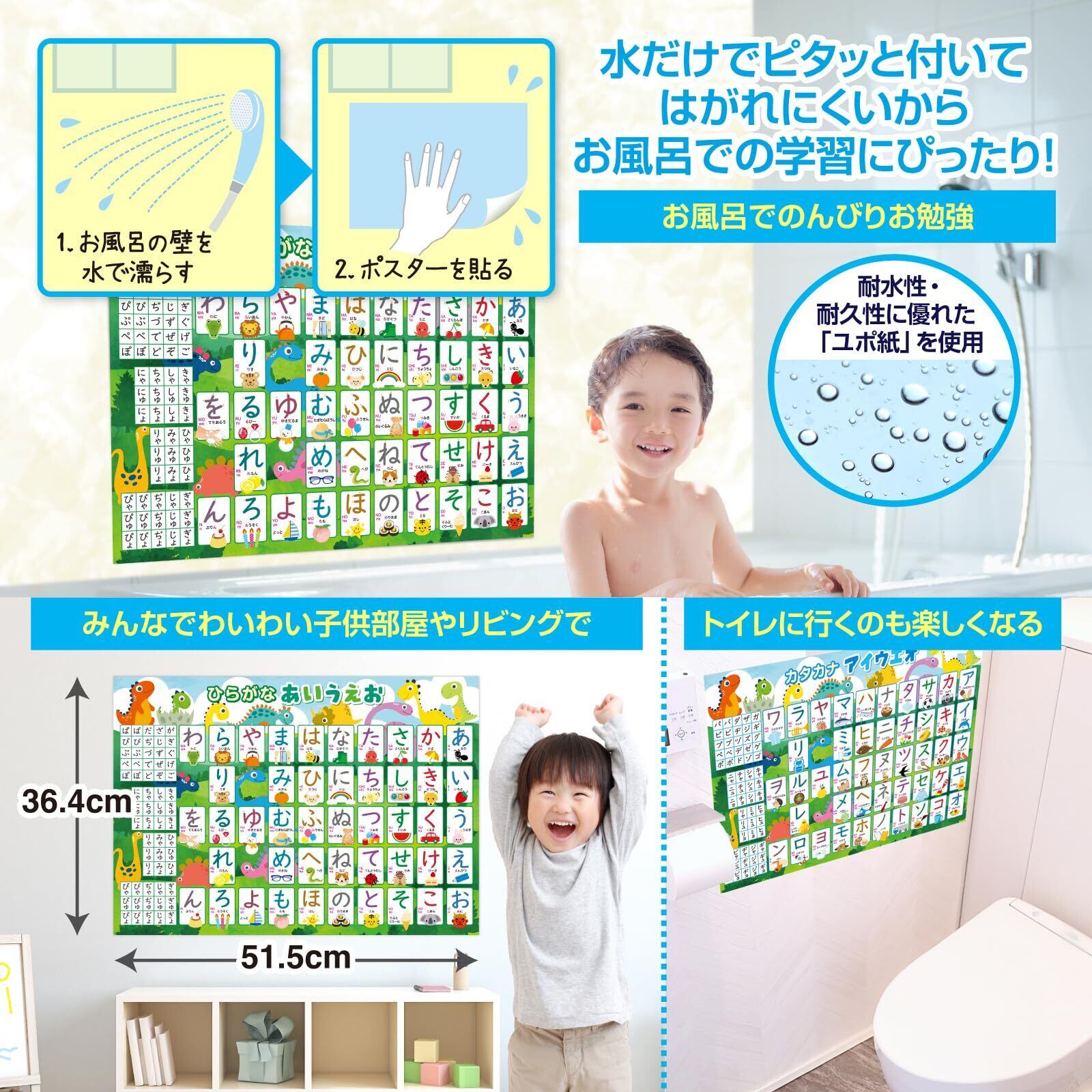 お風呂の学校 ひらがなとカタカナ お風呂ポスター 2枚セット 日本製 恐竜デザイン お受験 知育 学習 あいうえお表 B3サイズ 防水