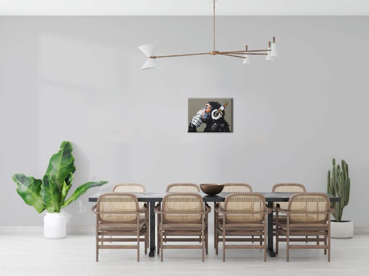 『音楽を聴いている猿』キャンバス絵画 バンクシー Banksy 現代の動物装飾画 チンパンジー 落書きPIY PAINTINGアートパネル ウォール フレームポスター 木枠付きの完成品 取り付けやすい壁アート 複製名画 インテリア 新築飾り 壁掛け 玄関、洗面所、キッチン、寝室の飾り ソファの背景絵画 会社の事務所にアクセントとして クリスマスのギフト(木枠付き、30x40cm、1枚パネル)
