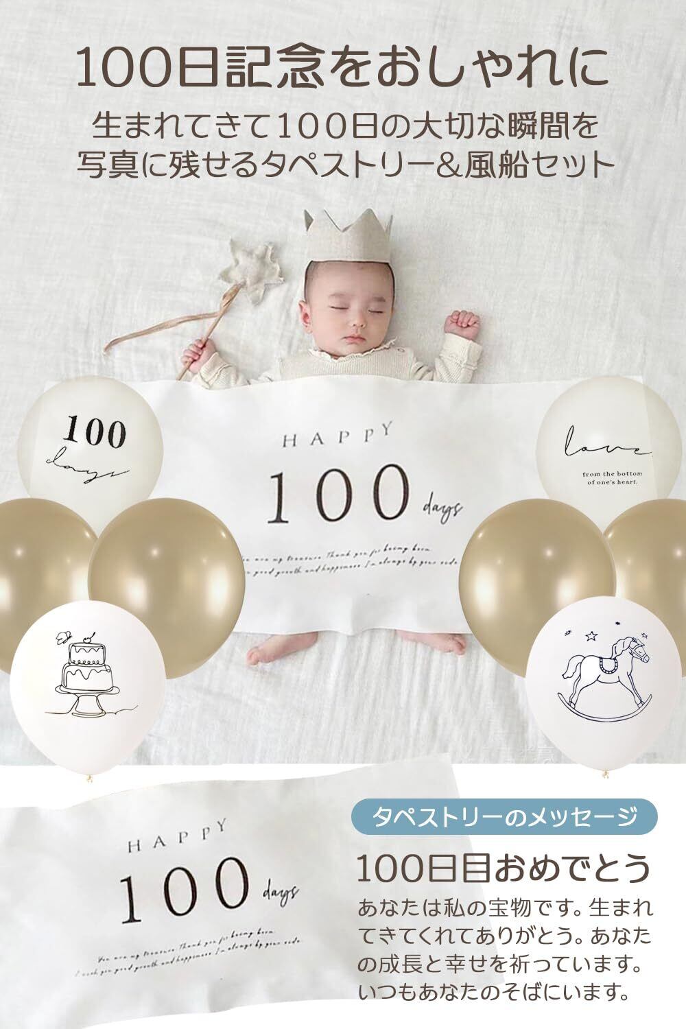 【 セット内容 】 タペストリー×1、100日風船×1、LOVE風船×1、木馬風船×1、ケーキ風船×1、ベージュ色風船×4、銀色テープ×1クリップ×2、両面テープ×4、フック×2