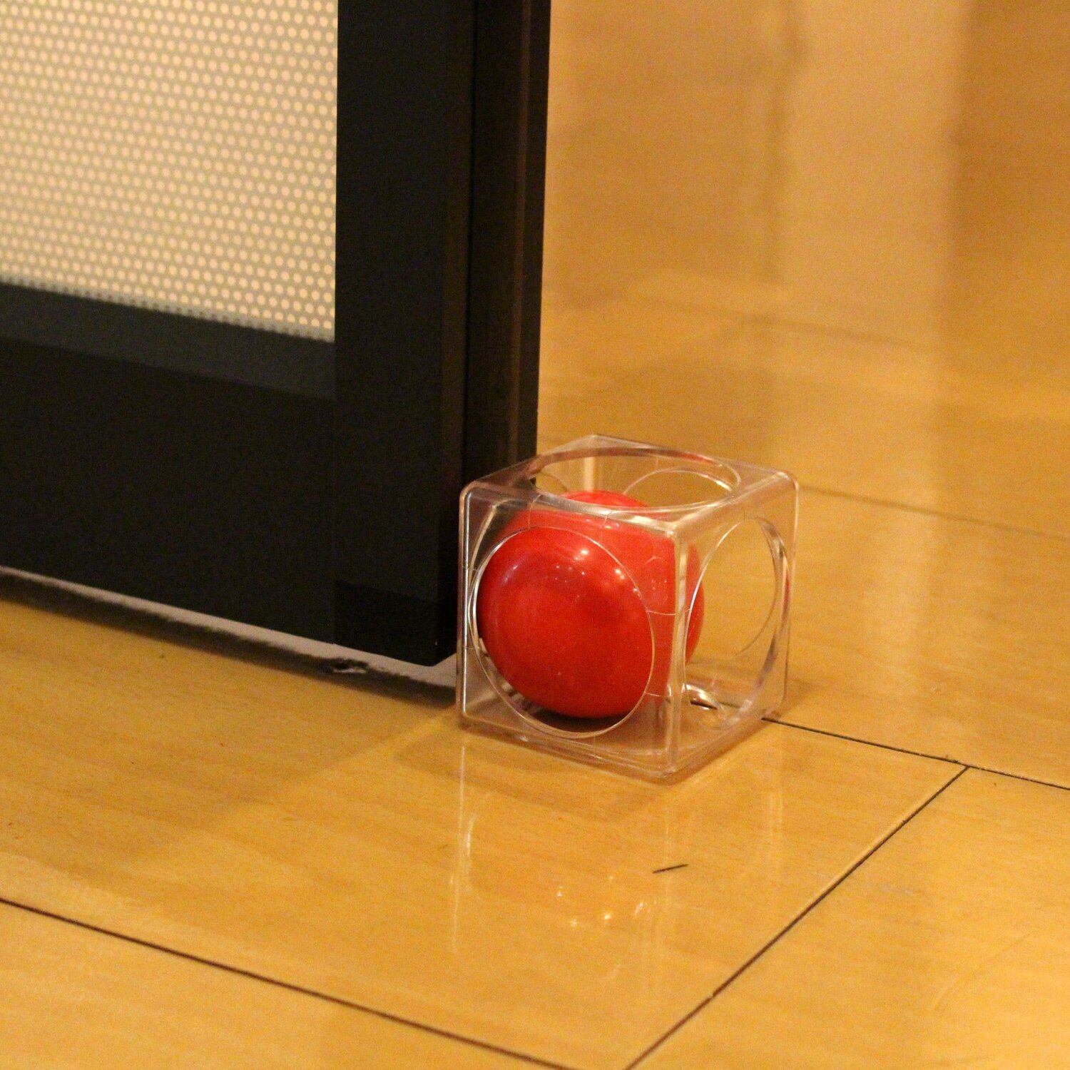 ドアクローザーのついているドアの前に「Door Cube」を置くと、ドアに押されてボールとドア面・床面の2点で大きな摩擦が生じ、同時にドアに押され変形したボールが元に戻ろうとする反発力によってドアが止まります。