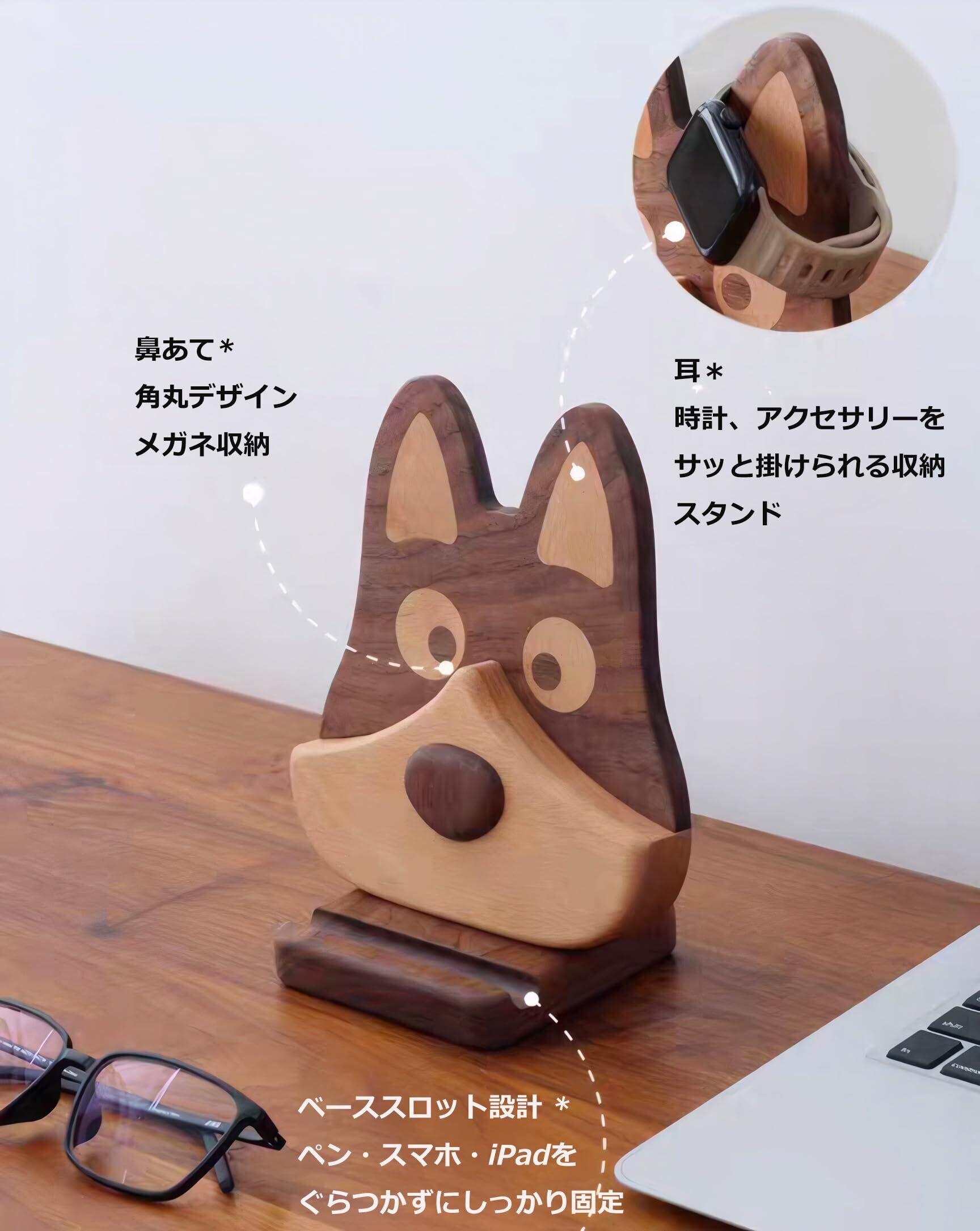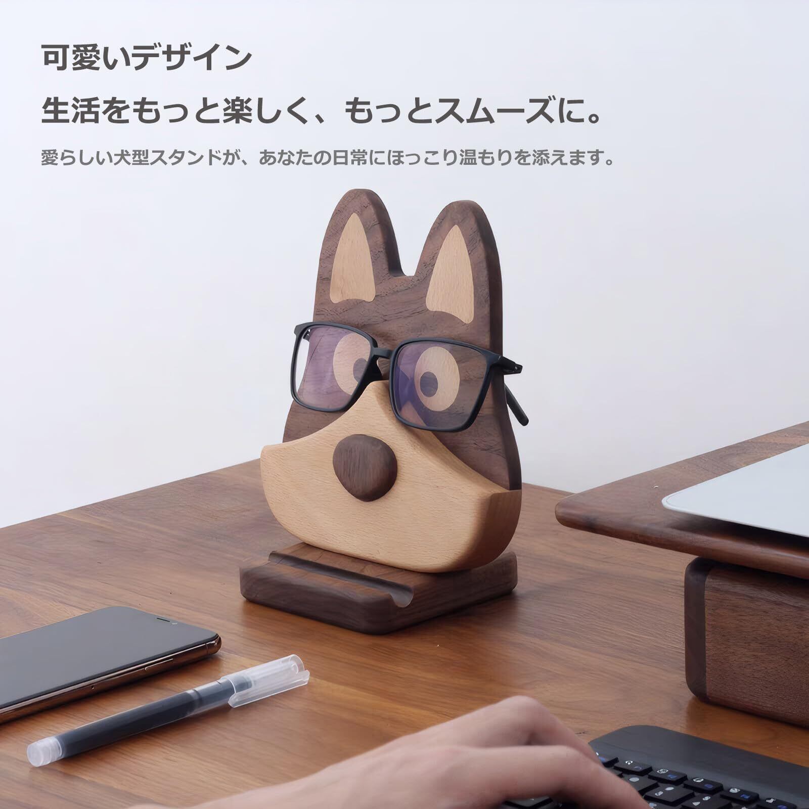 Sakulaya メガネスタンド デスク周り 便利グッズ 卓上 置き メガネ置き スマホスタンド兼用 おしゃれ 木製 犬型 可愛い デスク収納 癒しグッズ クルミ材