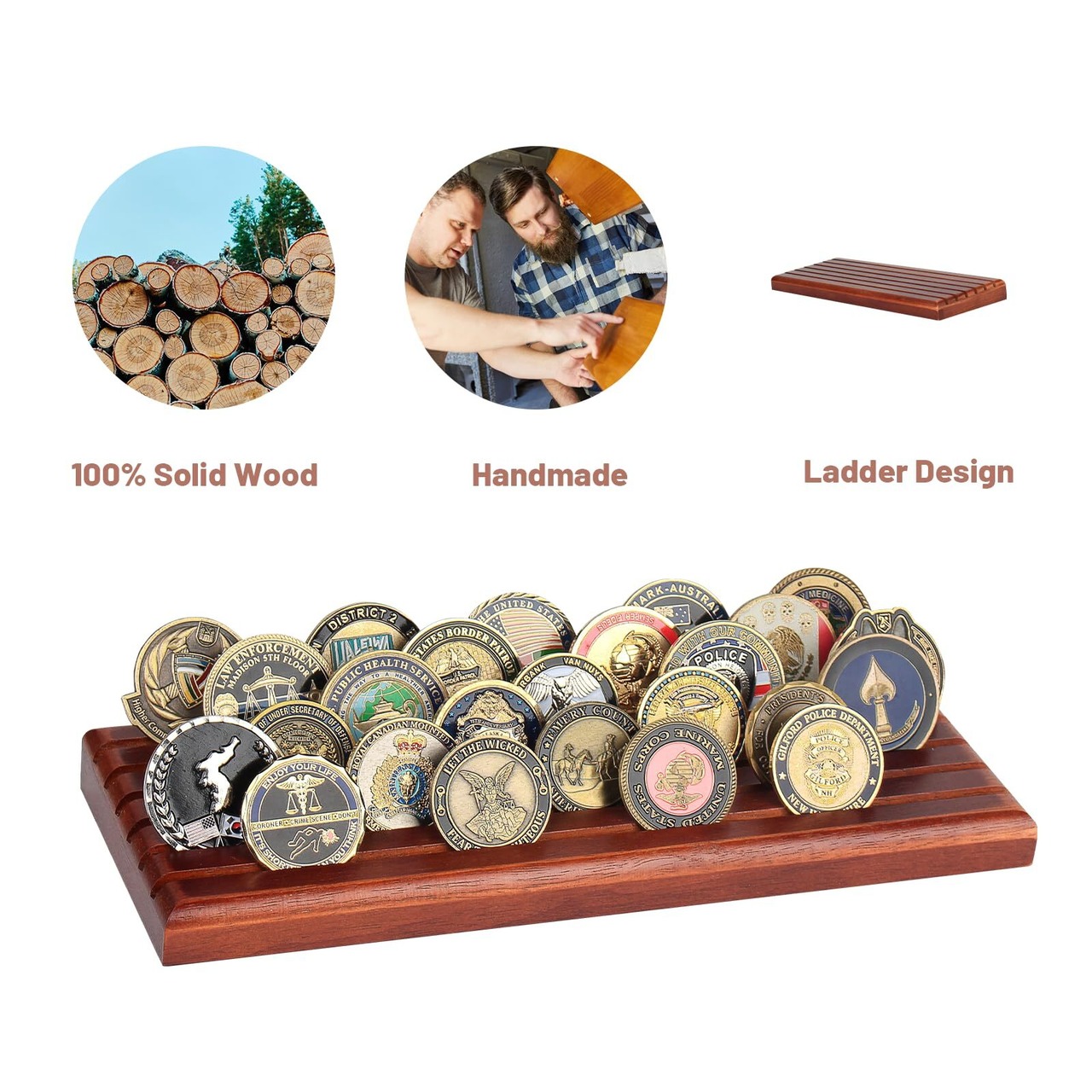 Samplife チャレンジコインホルダーディスプレイ、ミリタリーコインスタンド4段、木製アーミーコインホルダーディスプレイラック、アーミーコレクターコインケースデスク装飾(ブラウン、ミディアム)