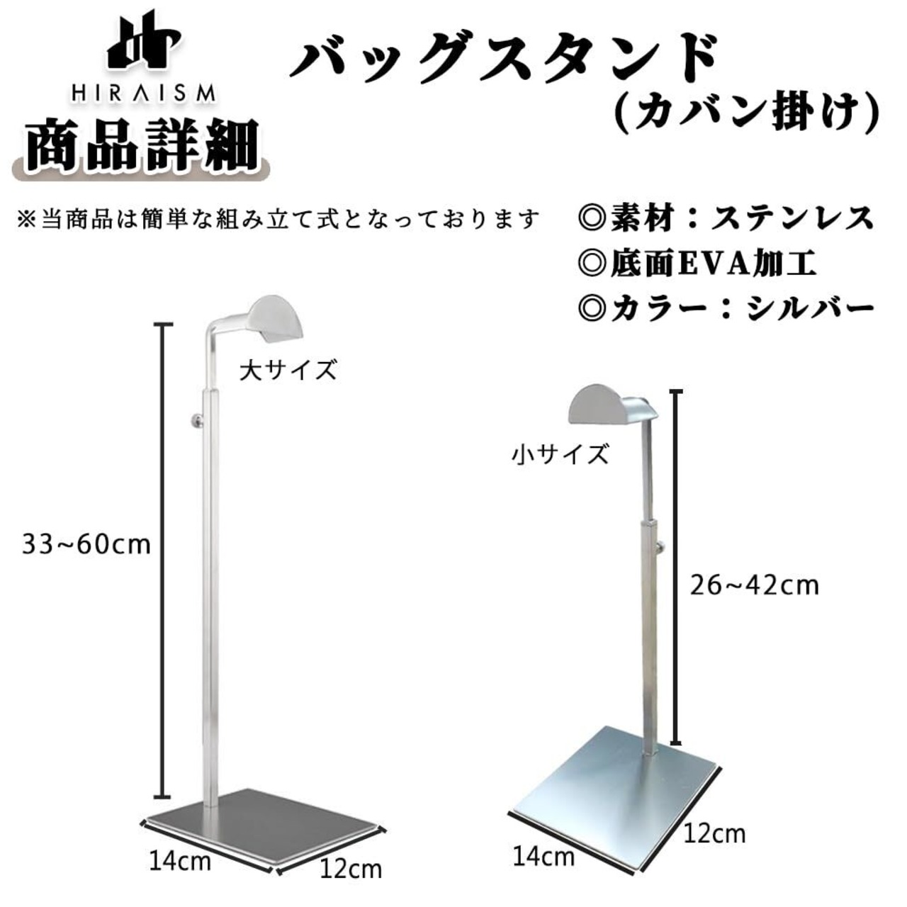 【商品内容】バッグスタンド (カバン掛け) 素材:ステンレス 土台サイズ:12×14cm <高さ調節幅> 小サイズ:26〜42cm 大サイズ:33〜60cm 備考:底面裏側はEVA加工済み (滑り止め) ※当商品は簡単な組み立て式となっております。