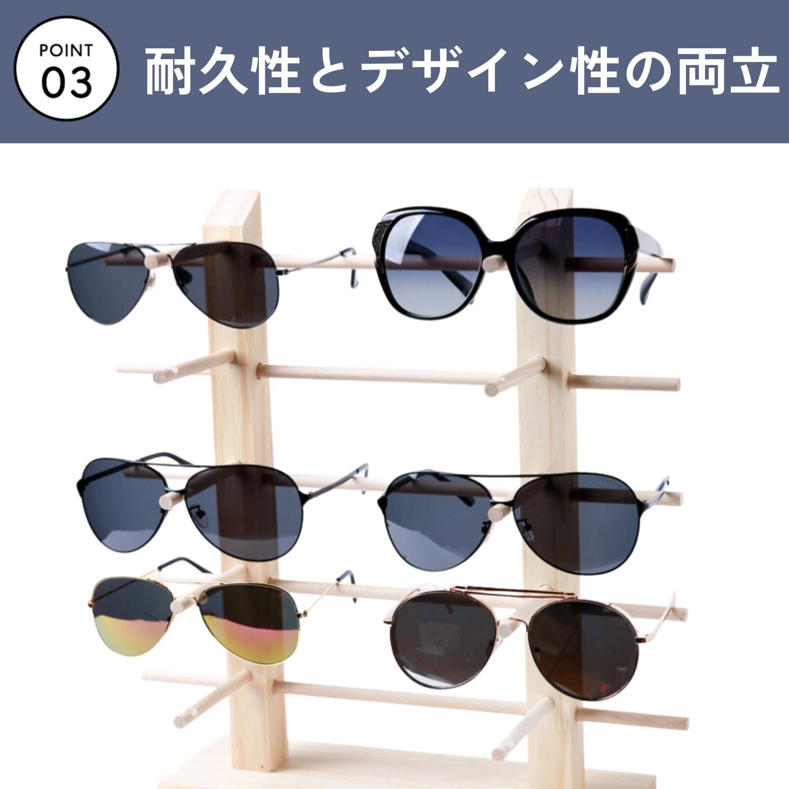 【耐久性とデザイン性の両立】長く使える木製スタンド。耐久性に優れた木材を使用し、温かみのある木目がインテリアにも調和します。サングラスや老眼鏡、スポーツサングラスまで幅広く対応し、長期間安心して使用可能です。機能性とデザイン性を兼ね備えた一品です。