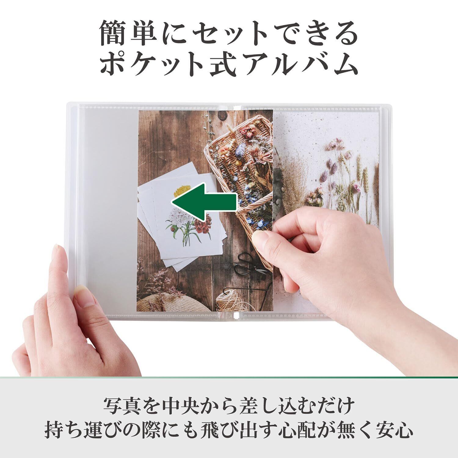 写真はページ中央から横方向に差し込むだけのポケット式。写真が収納しやすく、逆さまにしてもこぼれないので持ち運びの際も安心です。