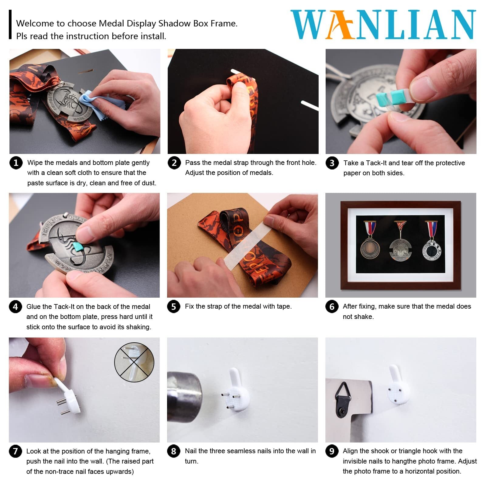 メダルディスプレイフレームには、トレースなしネイル1個とフォームステッカー3個が含まれています。 メダルディスプレイフレームの背面は開閉が簡単で、ツール不要です。 リボンをスロットに通して背面の位置に固定します。 ミリタリー メダル ディスプレイ ケースは、垂直または水平に壁に掛けたり、テーブルに置くことができます。 オフィスやご自宅で素晴らしい外観になります。