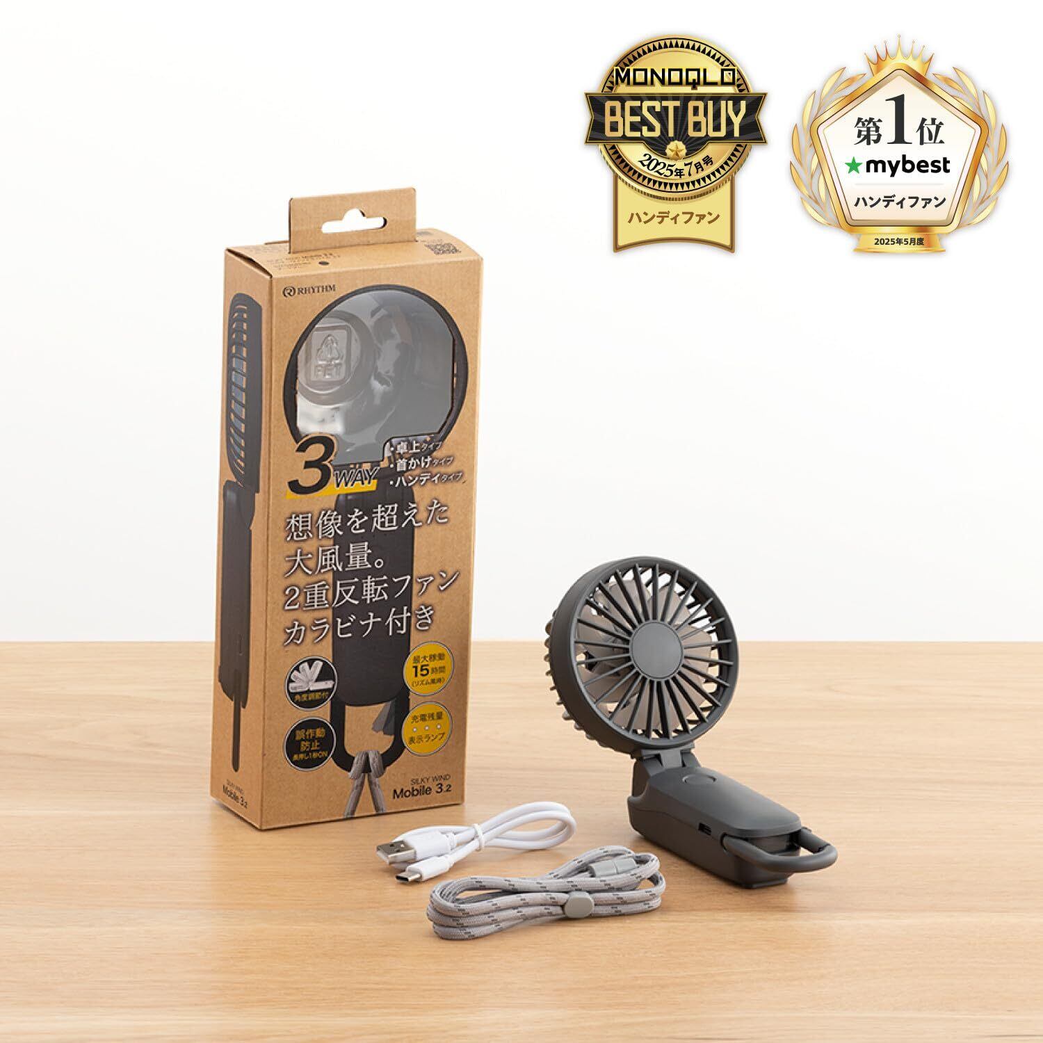 リズム(RHYTHM) ハンディファン 2025 大風量 静音 3WAY (手持ち 首掛け 卓上) [国内メーカー] 風量5段階 Type-C対応 カラビナ&ストラップ付き 小型 携帯扇風機 Silky Wind Mobile 3.2 ダークグレー 9ZF040RH82