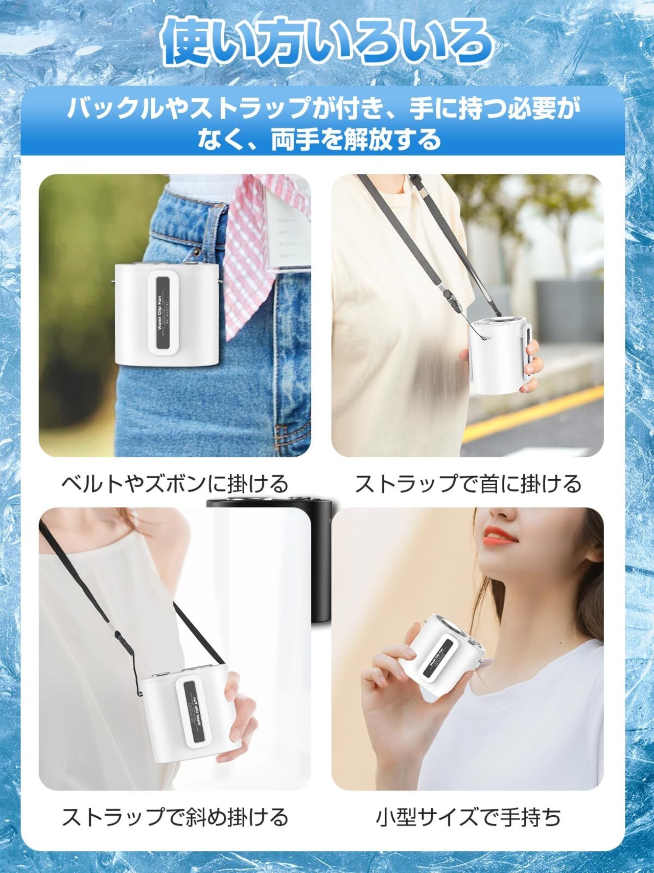 【ハンズフリーで自由自在】:手に持つだけでなく、ベルトに挟んだり、付属のストラップで首に掛けることもできます。両手が自由になるため、屋外での作業やキャンプなど、さまざまなシーンで快適に使用できます。