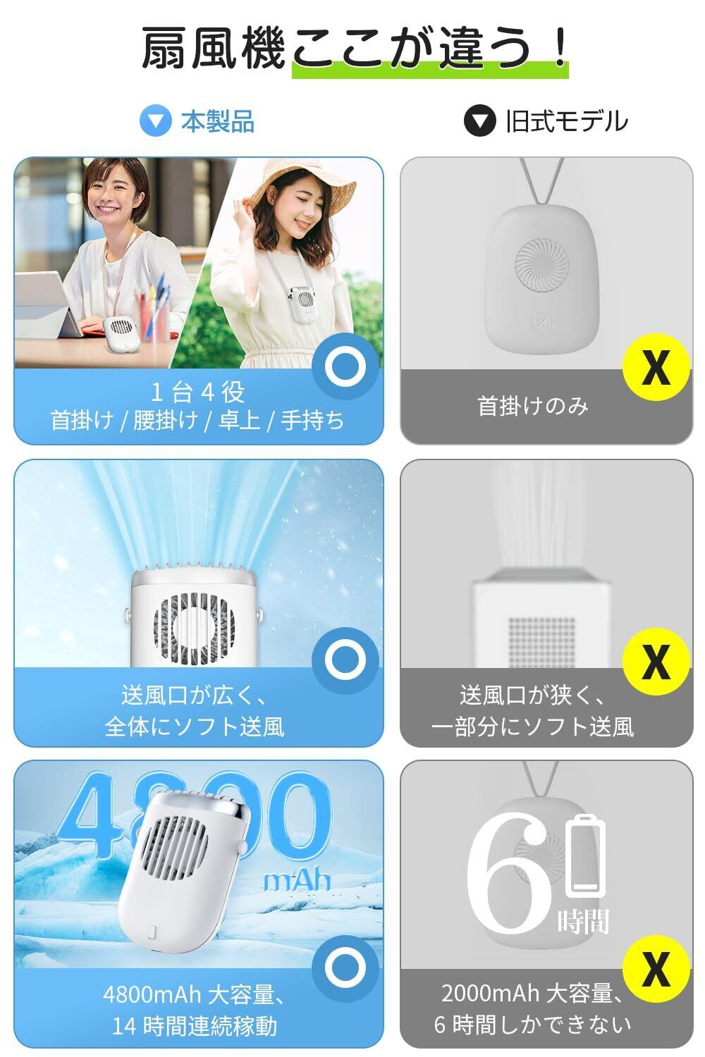 【1台4役 多機能扇風機】「首掛け扇風機」:ネックストラップ付き、首にかけばマスクつけでも、この夏も快適に!「腰掛け扇風機」:腰に付けるだけ、涼しく感じる!「卓上扇風機」:スタンドが本体に付けてあるので、とこでも置けます。「手持ち扇風機」:いつでもとこでも涼風を感じる!