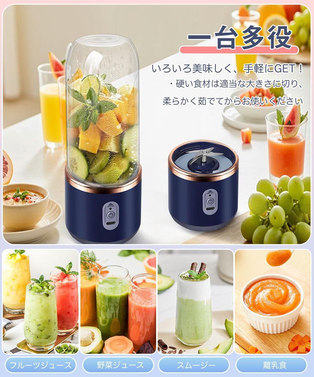 ジューサー ミキサー 一台多役 コードレス 22000回/分高速回転 400ML*2大容量 果物 野菜 ジュース 離乳食用 栄養補充 Type-C充電式 小型 ミニ 一人用 お手入れ簡単 持ち運びやすい 出張/旅行/アウトドア/オフィス (ブルー)