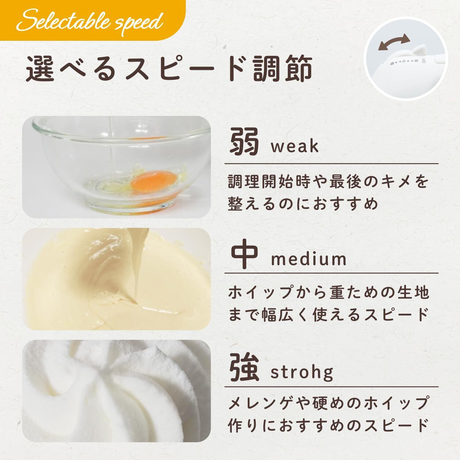 【スピード調節】混ぜ具合や材料に合わせて自由にスピード調節できます。弱〜中〜強と選べてスライド式だから切替も簡単です。