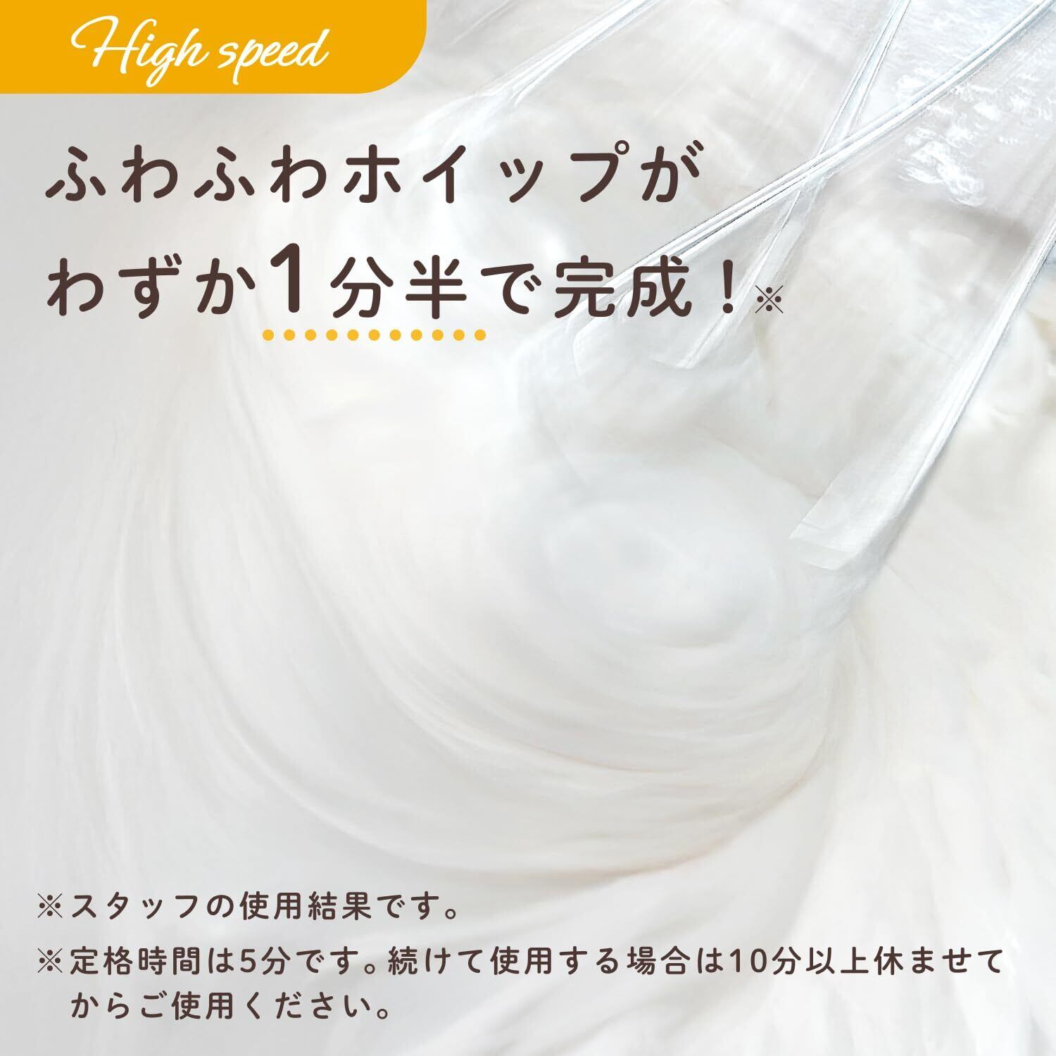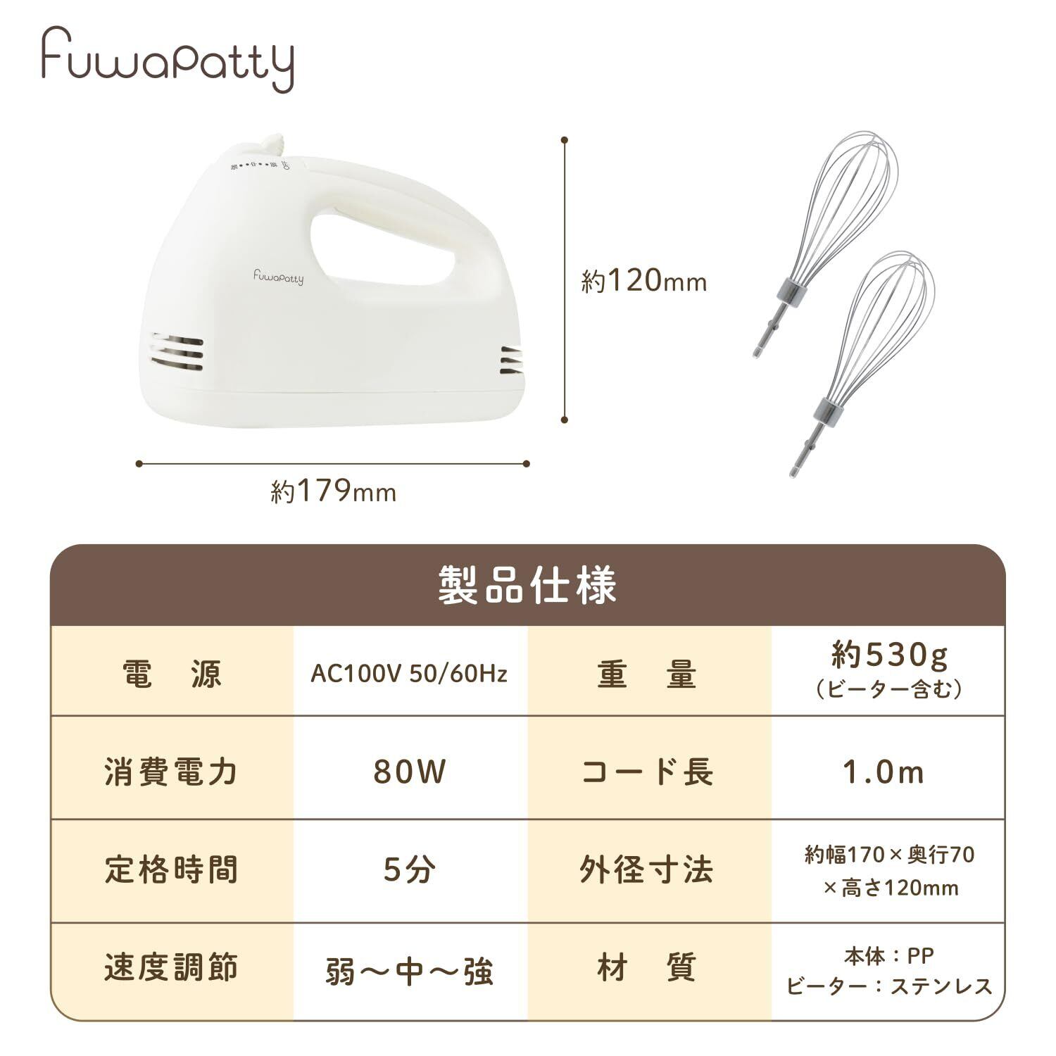【製品仕様】電源:AC100V 50/60Hz、消費電力:80W、定格時間:5分、速度調節:弱〜中〜強、重量:約530g(ビーター含む)、コード長:1.0m、外径寸法:約幅179×奥行70×高さ120mm、材質:本体:PP、ビーター:ステンレス、期間:メーカー期間1年