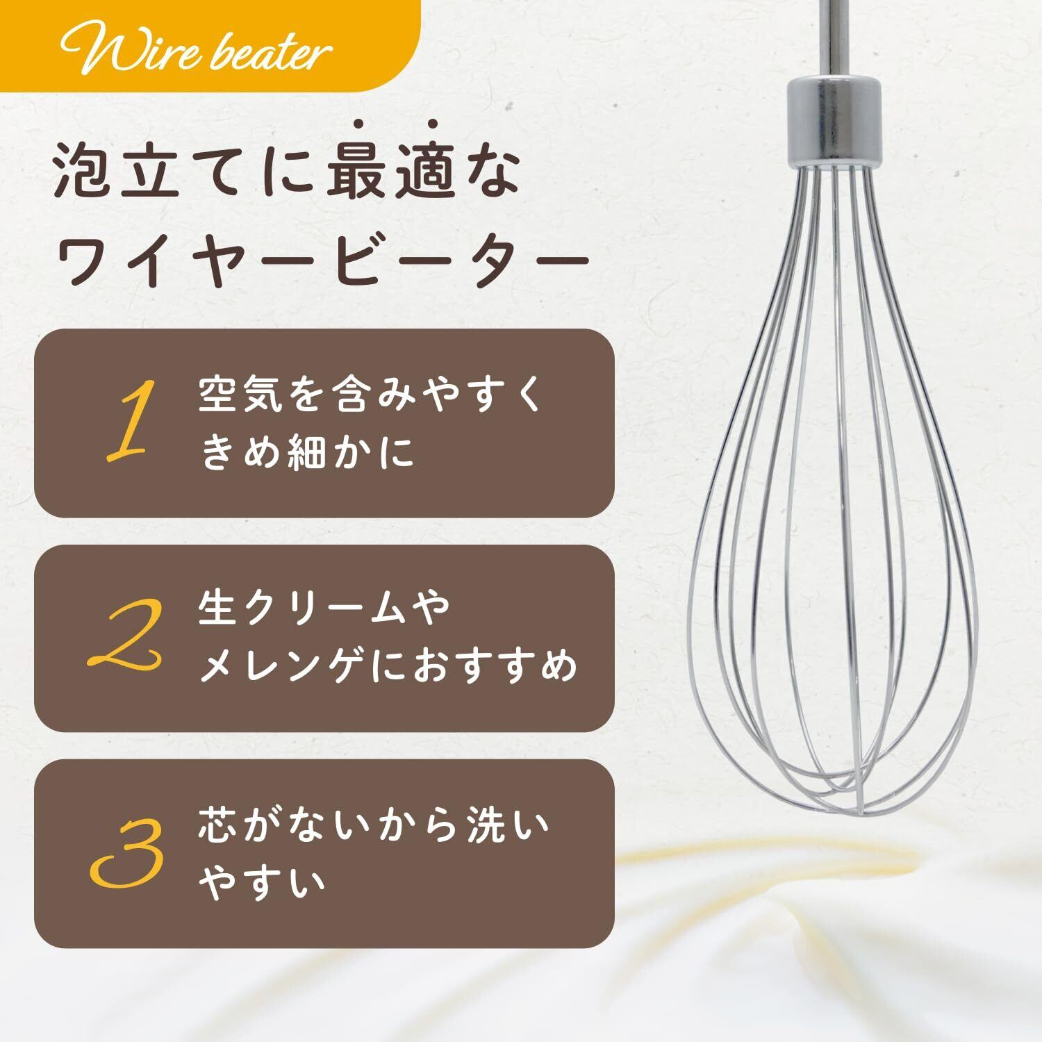【ワイヤービーター】泡立てに最適な細くて本数の多いワイヤービータータイプ。ホイップやメレンゲも簡単に作ることができます。
