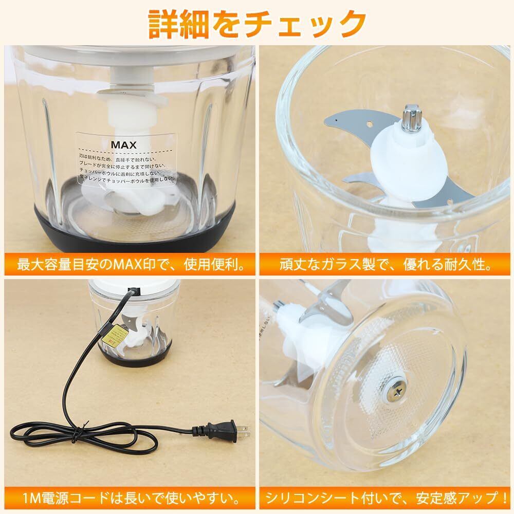 【S字型2層ステンレス刃】本フードプロセッサーは切れ味鋭いの4枚刃、よりすばやく均一に刻むことができます。 フードチョッパーはS字型2層ステンレス刃のおかげで、この電動ブレンダーは、食材を約10秒以内で刻むことができます。ワンタッチボタンで操作簡単!鋭利な刃で、鋭い切れ味、時間と手間を賢く省いて、料理に合わせて大活躍。