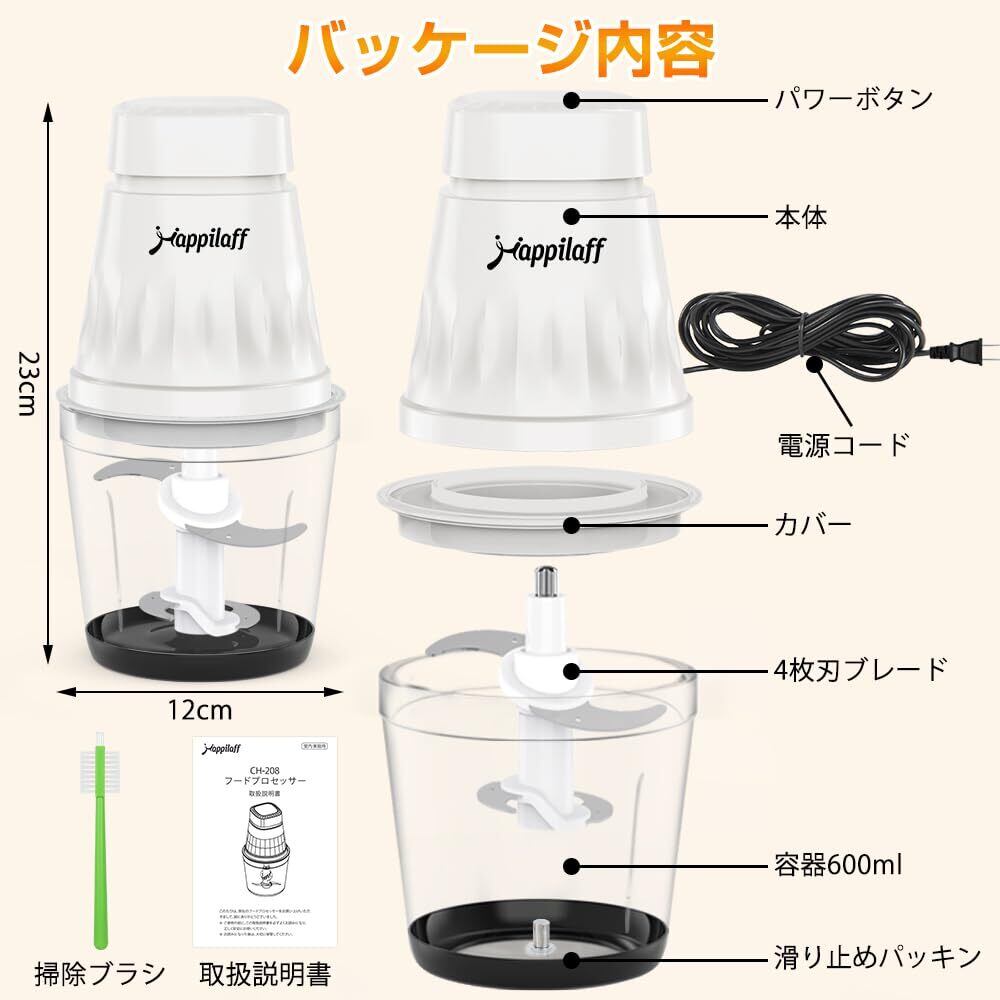 【1台5役&料理の幅が広がる!】happilaffフードプロセッサーは350Wの純銅モーターを搭載し、安定且つ抜群な稼動を確保し、混ぜる・つぶす・刻む・砕く・練るの機能を1台で実現できます。ドライカレーやミックスジュース、離乳食まで幅広く活用できます。600mlの容量で、1~2人分の料理作るのはちょうど良いです。