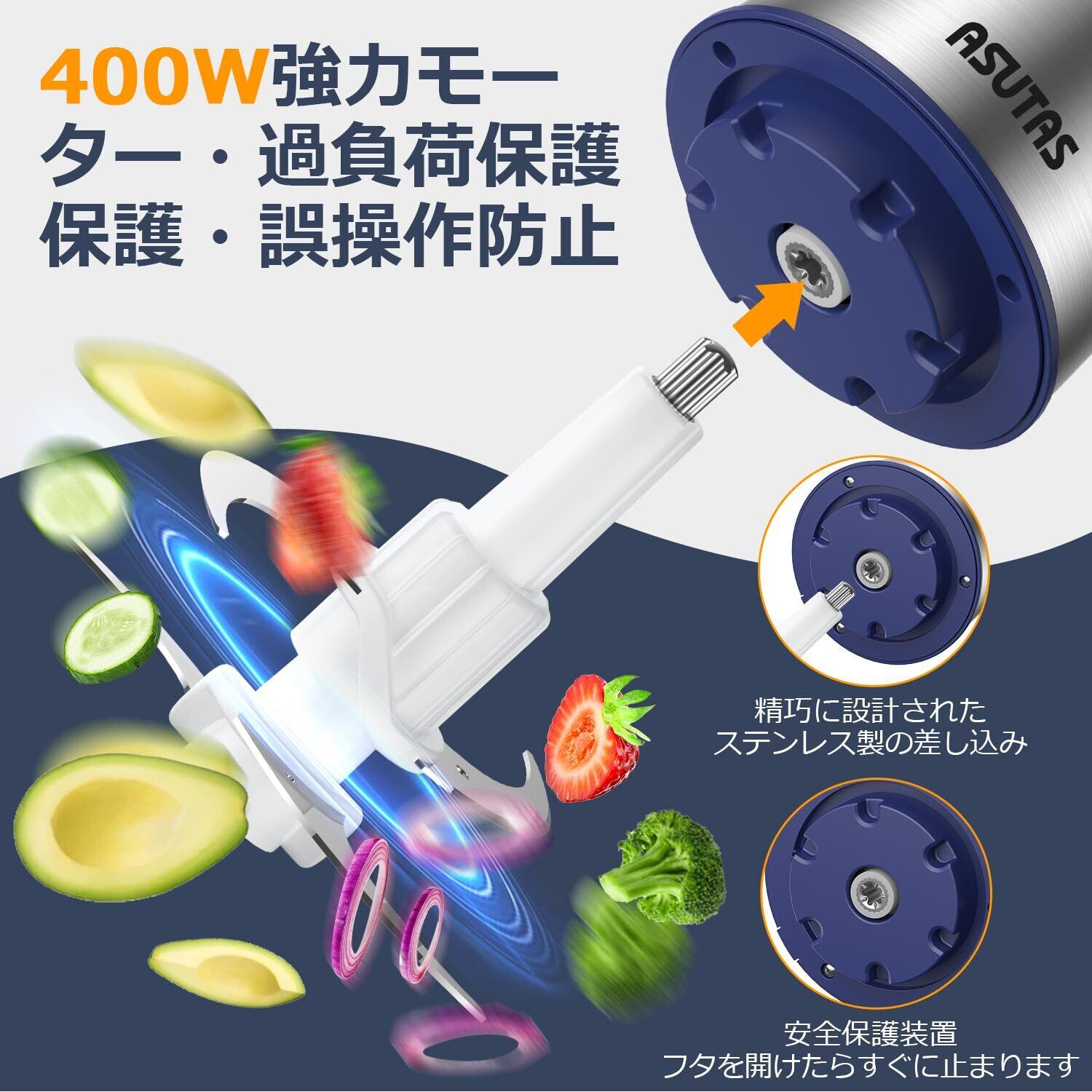 ASUTAS フードプロセッサー 2L大容量 【2ボウル】 1台5役 (刻む・混ぜる・潰す・砕く・粗おろし) 400Wハイパワー 2段階スピード 4枚刃カッター フードチョッパー 氷も砕ける ブレンダー 離乳食 電動 挽肉 みじん切り フードミキサー 家庭用 水洗い可能 スムージー PSE認証