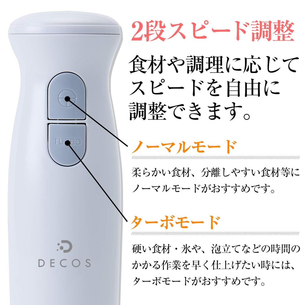 当社は山口県にある総合通販企業です。安心してお買い物をお楽しみください。フードコーディネーターもおすすめのDECOSハンディブレンダー。とても軽くて操作も簡単で使いやすいです。ハンドブレンダーを探す際に必ず注目してほしいのが本体の重さです。重いハンドブレンダーで作業をするのは手が疲れて本当に大変です。料理を手軽にするはずの道具を使うのが嫌になってしまいます。その点、このハンドブレンダーはブレンダースティックを装着した状態で550gと超軽量モデルです。軽量で操作も簡単なDECOSハンドブレンダーを是非オススメします!カチッと簡単に外れてお手入れも簡単です。時間のかかるみじん切りやミンチが数秒で出来上がるのでかなりの時短になります。フードコーディネーター小野かずみさんのレシピが載った特典レシピブック付きです。またスパチュラ(ヘラ)も付いた特別セットです。