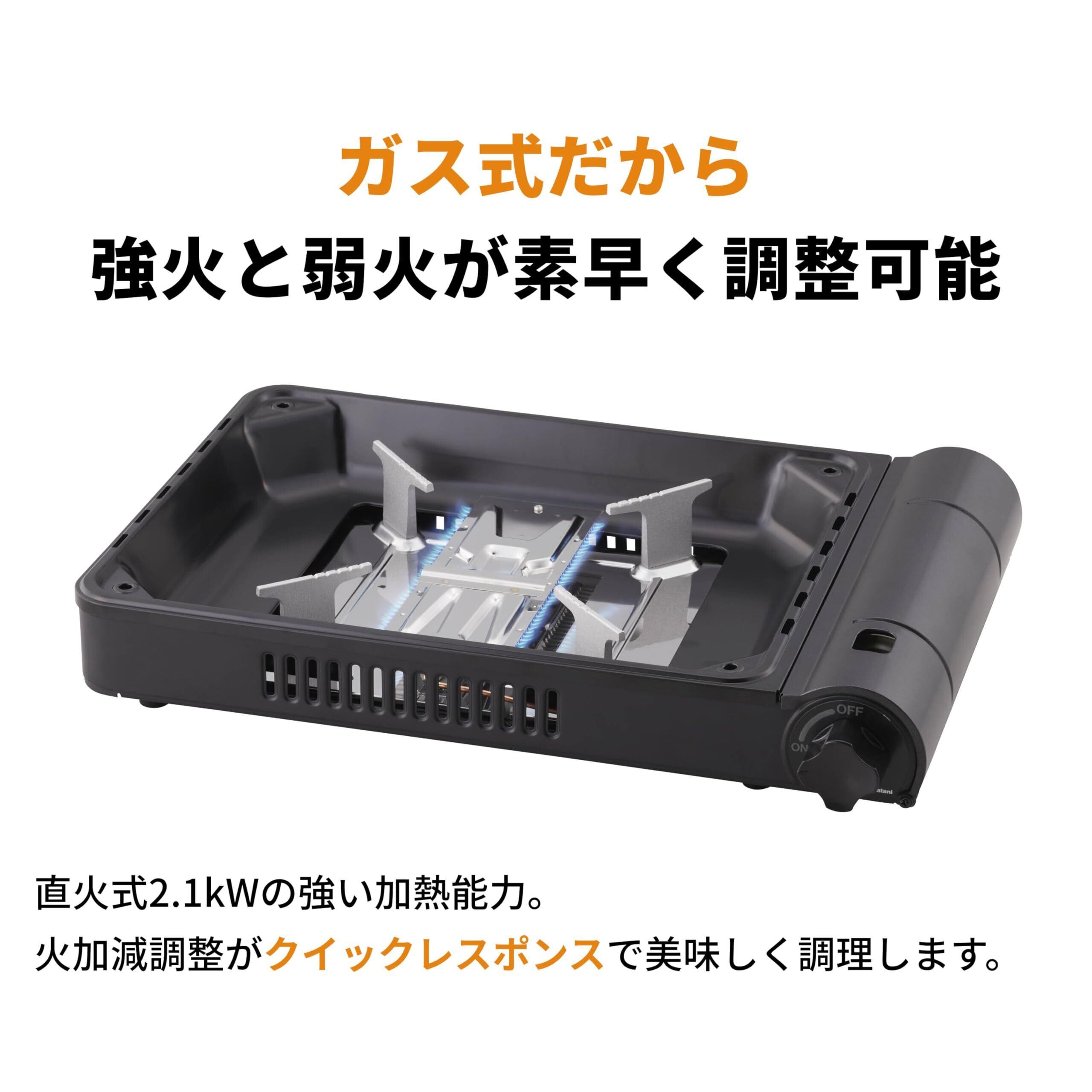 <仕様>【本体】 471×334×169mm 【プレート】 約342×268×22mm(内寸) 【本体の重さ】 約4.5kg 【火力】 2.1kW (1,800kcal/h相当、152g/h) 【連続燃焼時間】 約120分 【化粧箱サイズ】 523×373×176mm