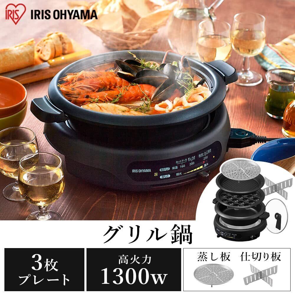 アイリスオーヤマ ホットプレート 電気鍋 グリル鍋 3枚タイプ 深鍋 焼肉プレート たこ焼きプレート 保温~約250℃ 付き 高火力1300W 2~4人用 IGU-B3-B ブラック