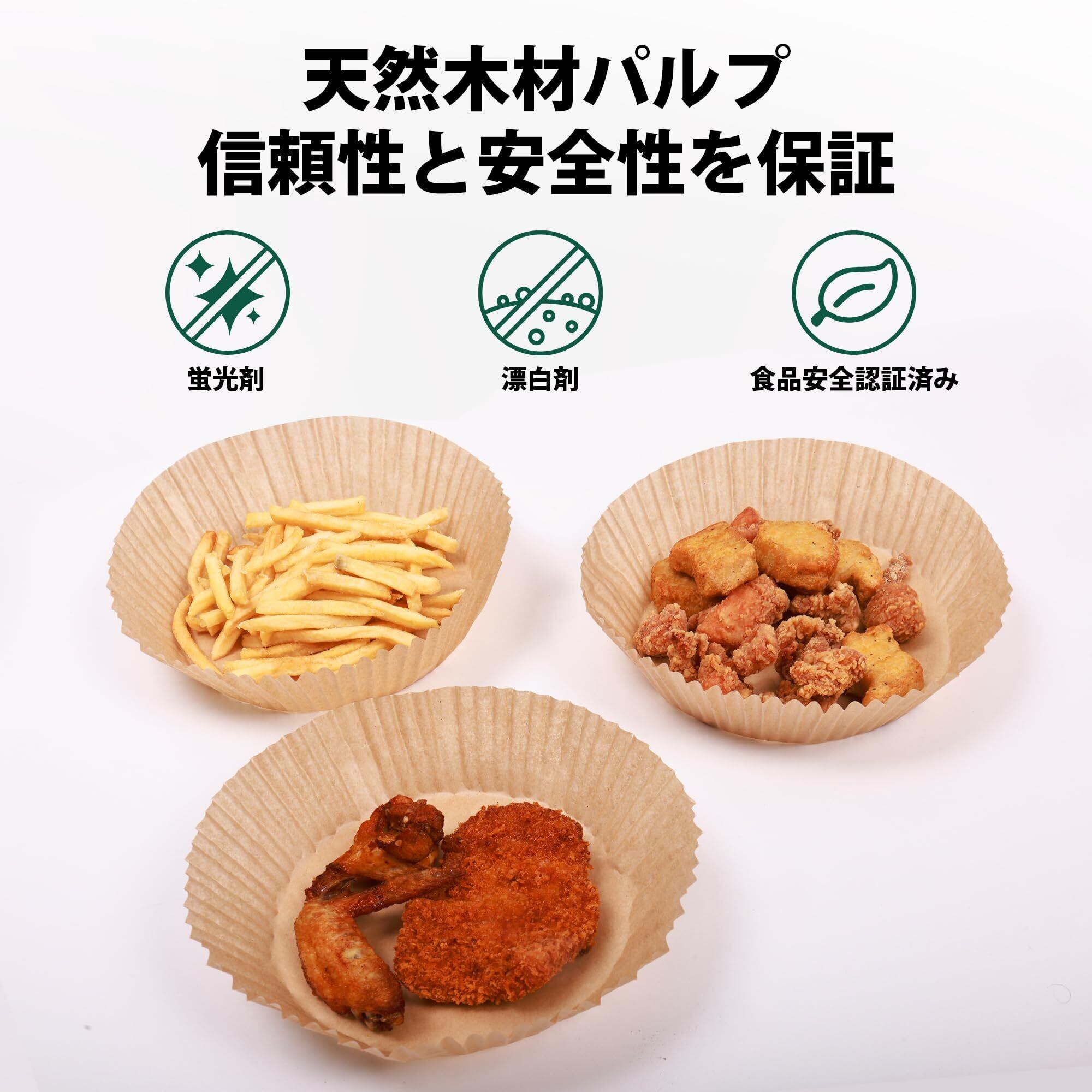 【耐水・耐油・耐熱】エアフライヤー用紙として、高耐熱性、耐水性、耐油性に優れていることが求められます。SAMKYOエアフライヤー用紙は、220℃高温までの温度に耐えることができ、エアフライヤー内部の熱風循環も妨げず、調理時間を大幅に長くすることはありません。