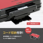 特徴 ■深さ約1.5mmの厚焼きプレート, ■熱効率の良いプレート一体型, ■フッ素コーティング加工, ■サーモスタットランプ, ■自動ロッククリップ&コード巻き取りステー