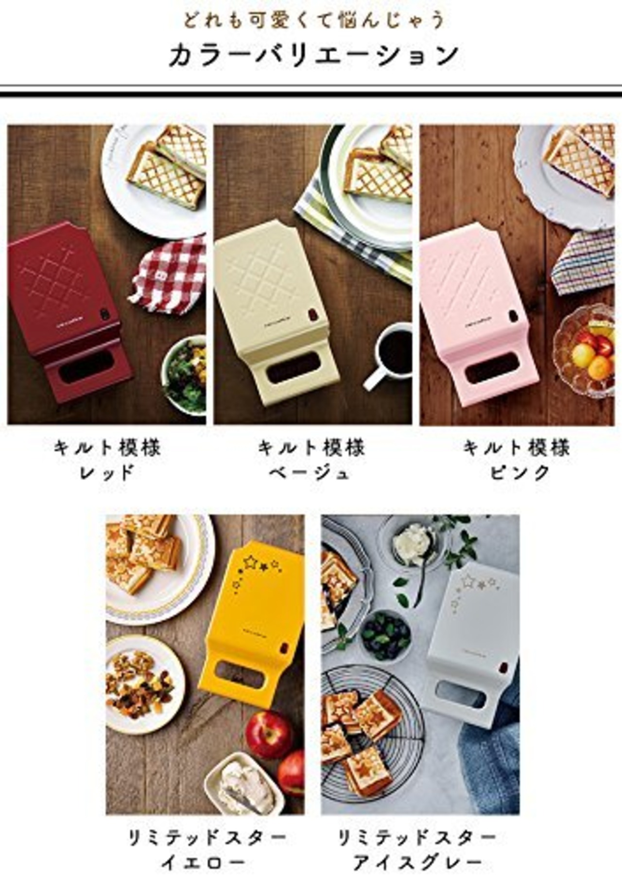 耳つき食パンがキルト模様に焼ける、recolte プレスサンドメーカー キルト。電源を入れて約2分半〜3分という短時間で、見た目にも美味しいホットサンドが焼き上がります。コンパクトで愛らしいデザインも魅力です。size:本体/高さ9.5×幅13×奥行23cmコード長さ:95cm重さ:1kg材質:本体/フェノール樹脂、プレート/アルミダイキャスト(ノンスティック加工)電源:100V 50/60Hz消費電力:600W期間:お買い上げ日より1年※箱入り※ご使用前に必ず取り扱い説明書をお読み下さい。made in China【キーワード】recolte レコルト プレスサンドメーカーキルト ホットサンドメーカー ホットサンド サンドイッチ 朝食 朝ごはん スイーツ デザート パーティー 両面焼き 1枚焼き ホットサンドレシピ 時短 キッチン家電 ※電化製品につき、通電・ご使用後のご都合返品は承れません。ご了承下さい。 【お取り扱い上のご注意】※電源コードを巻きつけたままでの使用はしないでください。電源コードが加熱して、破損・発火・火災の原因となります。※使用中にプレートに直接触れないでください。【お手入れ方法】熱が冷めた状態で毛先のやわらかいクッキングブラシなどで表面から残った食材やパ