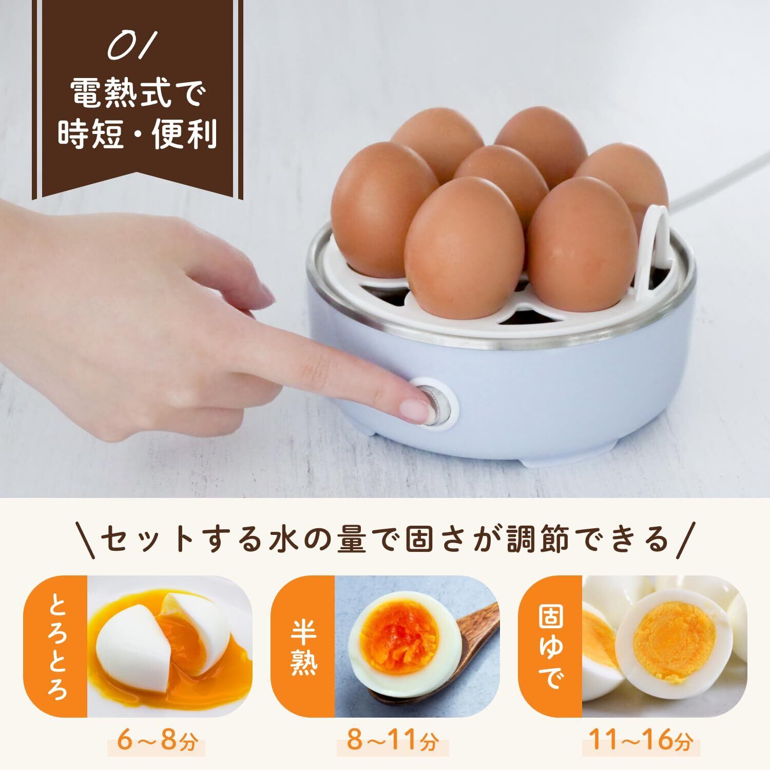 【かたさ調節】好みや料理に合わせて固さ調節が可能!セットする水の量を変えれば固ゆで、半熟まで幅広く作ることができます。
