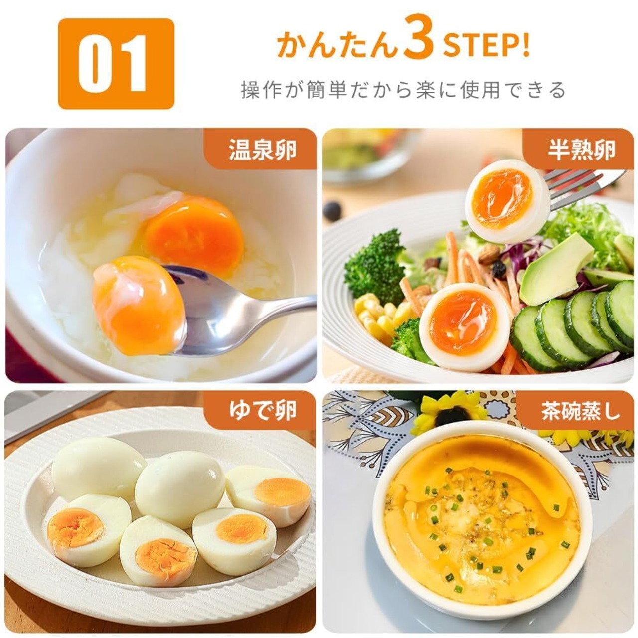 【多機能で食卓を豊かに、ユーグルトも作れる!】メニューは半熟卵/温泉卵/固ゆで卵/茶碗蒸し/茶葉卵/ユーグルトの6種類ございます。温度調節が難しい温泉卵やユーグルトまでこの一台で簡単に作れます。また、付属のケースを使えば、茶碗蒸しやプリン、サラダチキンやガレットまで手づくり“蒸し料理”もできてしまいます。レシピブックも付属しており、朝食やお弁当作りはもちろん、ダイエット食やおやつ作りなど幅広い料理をお楽しみください。