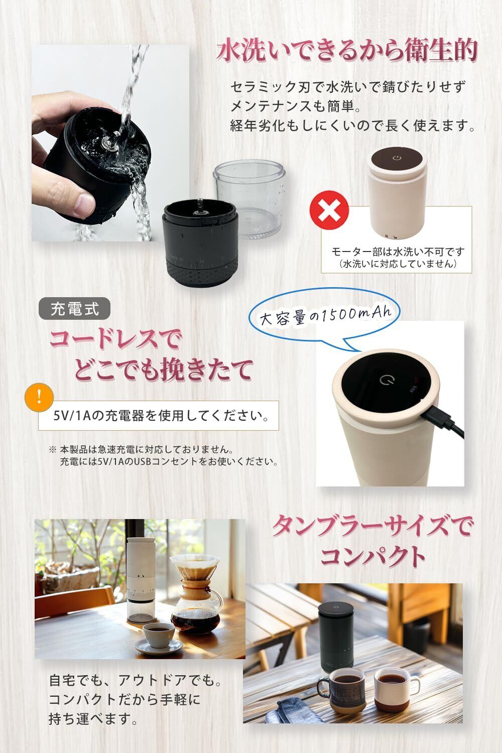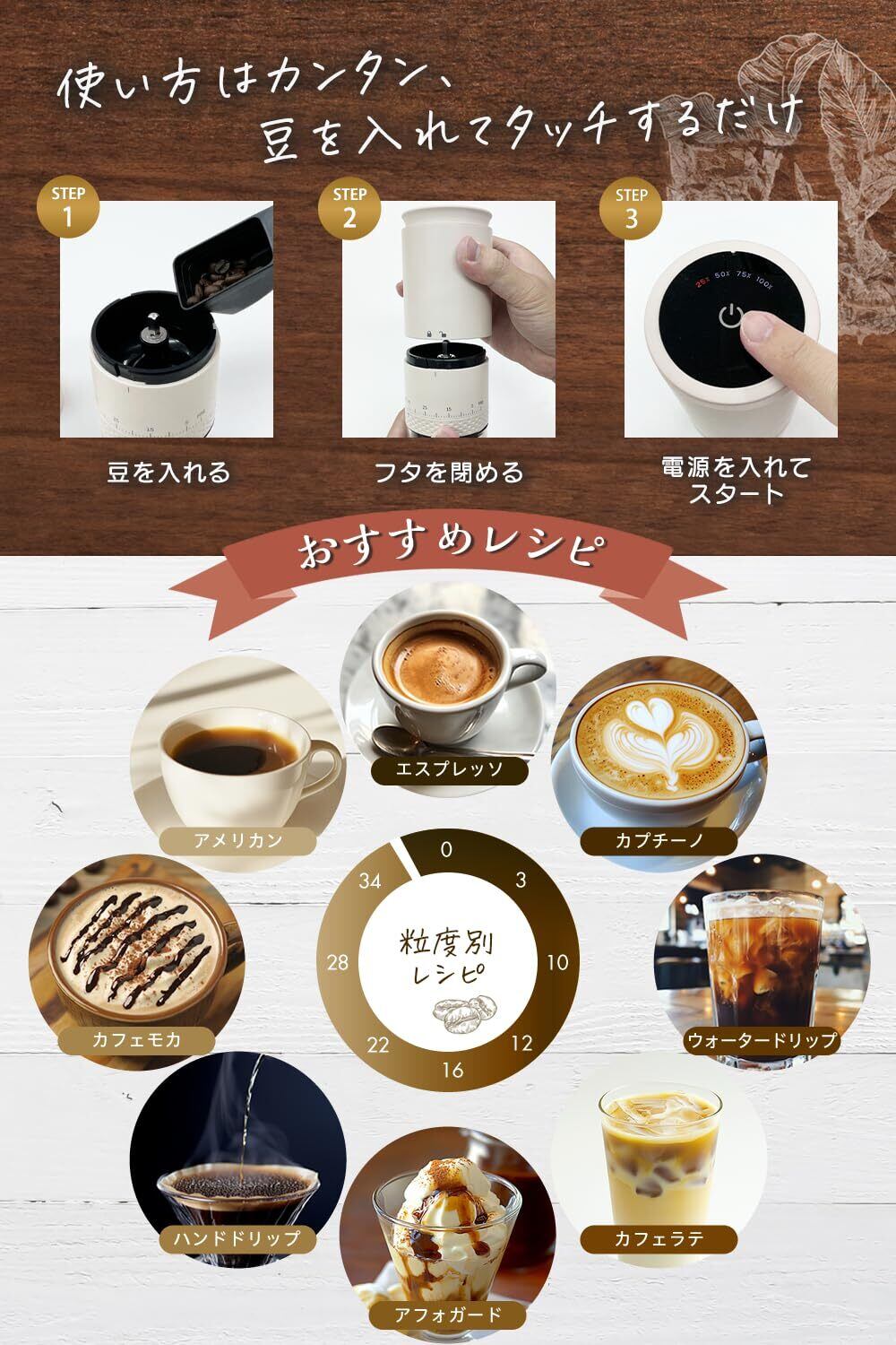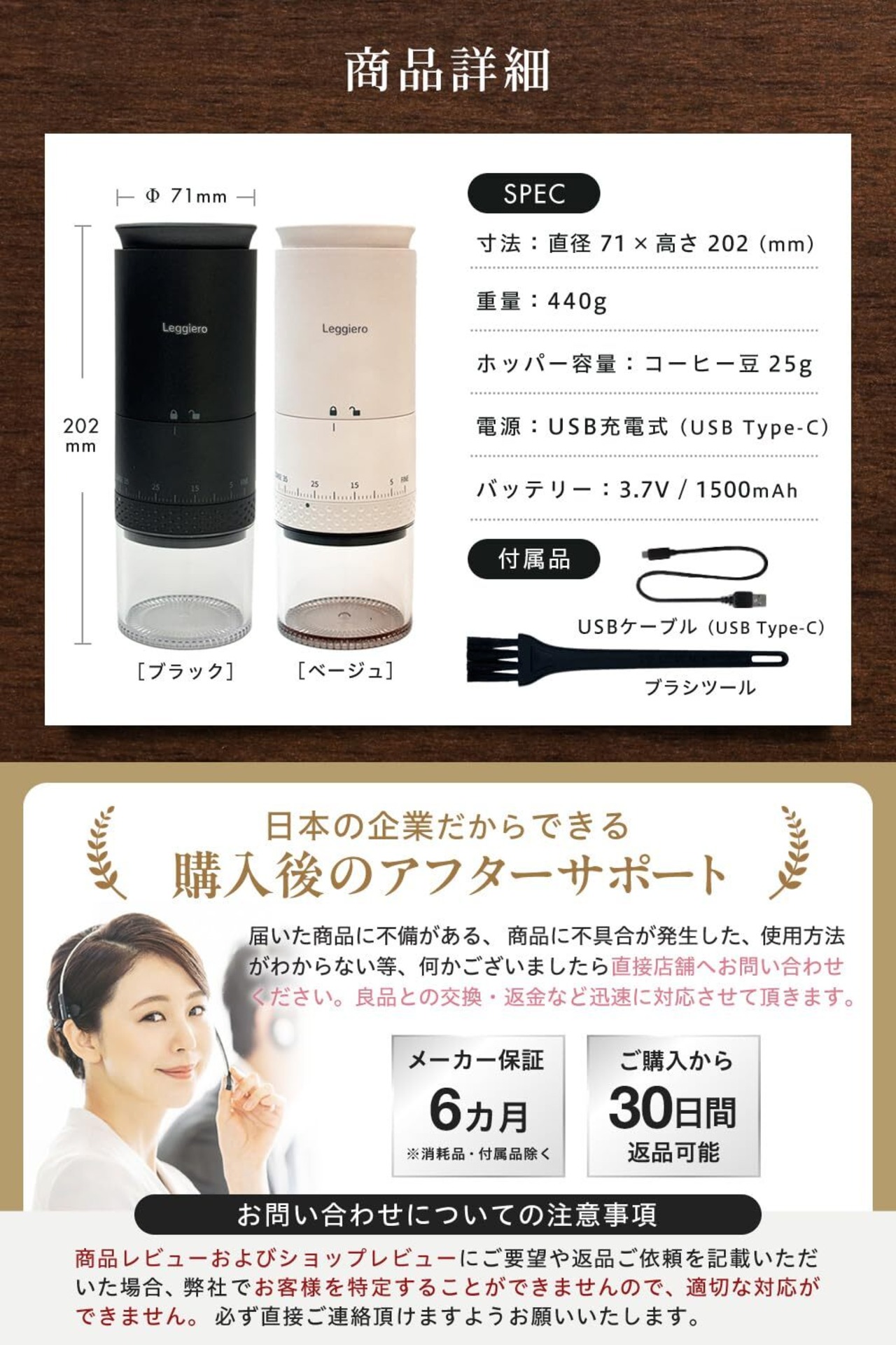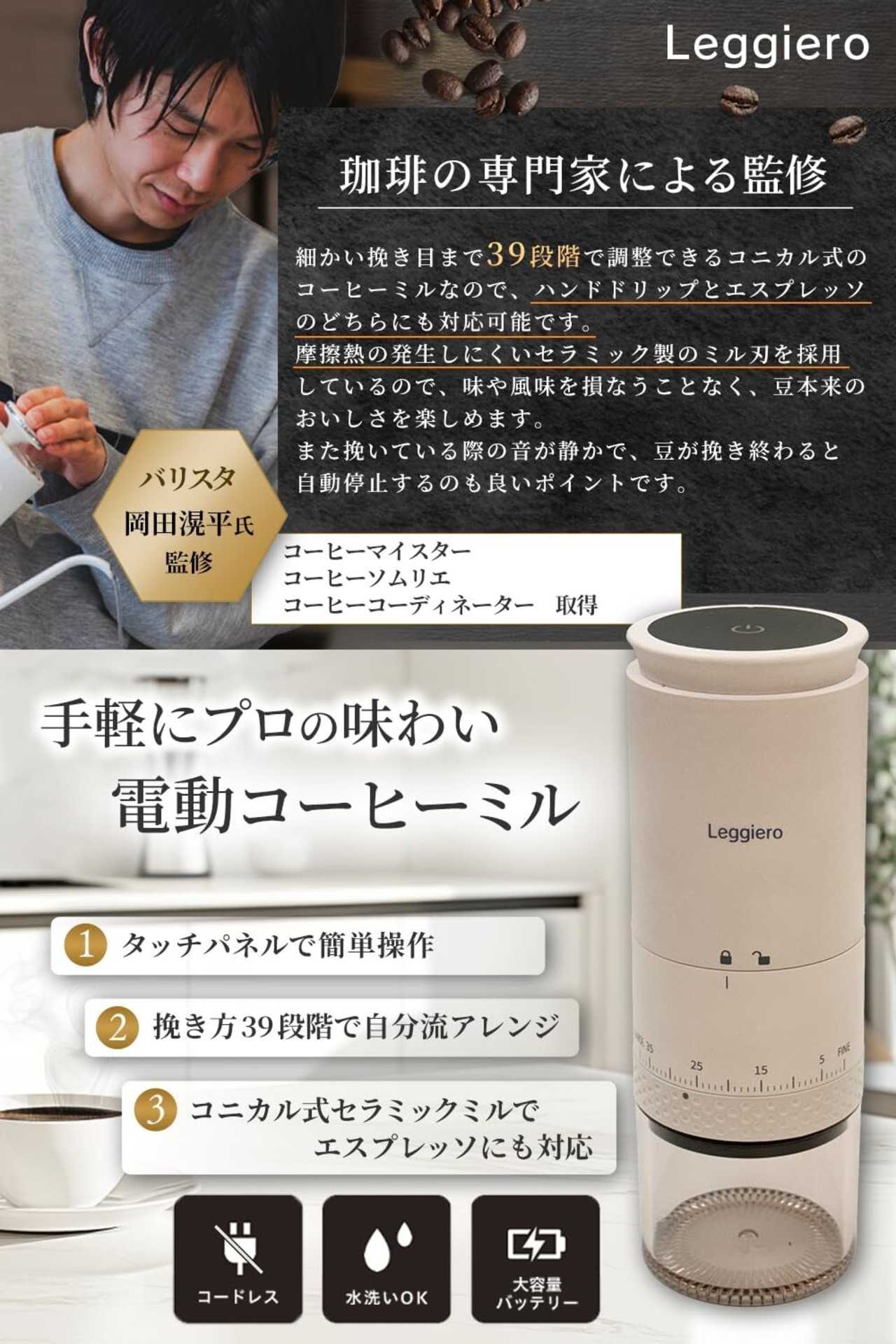 【バリスタ監修】 電動コーヒーミル コードレス 【タッチパネル操作x挽き目39段階カンタン調整】 Leggero コーヒーミル コニカル式 USB 充電式 水洗い可能 コーヒーグラインダー (ブラック)