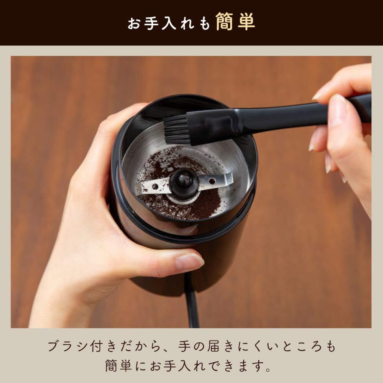 雑味の少ない香り深いコーヒーでぜいたくな時間をお楽しみください。【商品仕様】商品サイズ(cm):幅約8.7×奥行約9.5×高さ約14.5、製品重量(kg):約530g、材質:本体 プラスチック+SUS、蓋(透明) AS、カッター刃 sus301、掃除ブラシ(毛) PE、電源:AC100V 50/60Hz、定格消費電力:150W、MAX投入量:50gまで、カッター刃回転数:26000±15%rpm、連続運転時間:45秒(連続回転後は2分休止)、電源コード長さ:約1m、付属品:お手入れブラシ